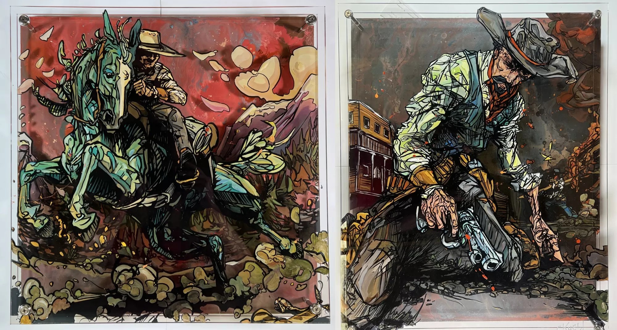 Western paintings and mixed-media works utilizing layered plexiglass that play up iconic cowboy characters in action, six-guns blazing. For Event Horizon, Kuehl injects a futuristic take on the old frontier.