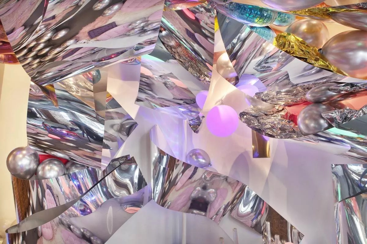 Sharon Louden, “Origins†(In collaboration with Hrag Vartanian) detail, 2019. Chrome silver balloons, Helium balloons, eight faux-fur and shag rugs, round pink cushions, purple cushions, large sheets of highly reflective raw aluminum, sheets of smaller raw aluminum, mylar thermal blankets, cordless LED balls, wall party lights, stools, chairs, monofilament and glue.