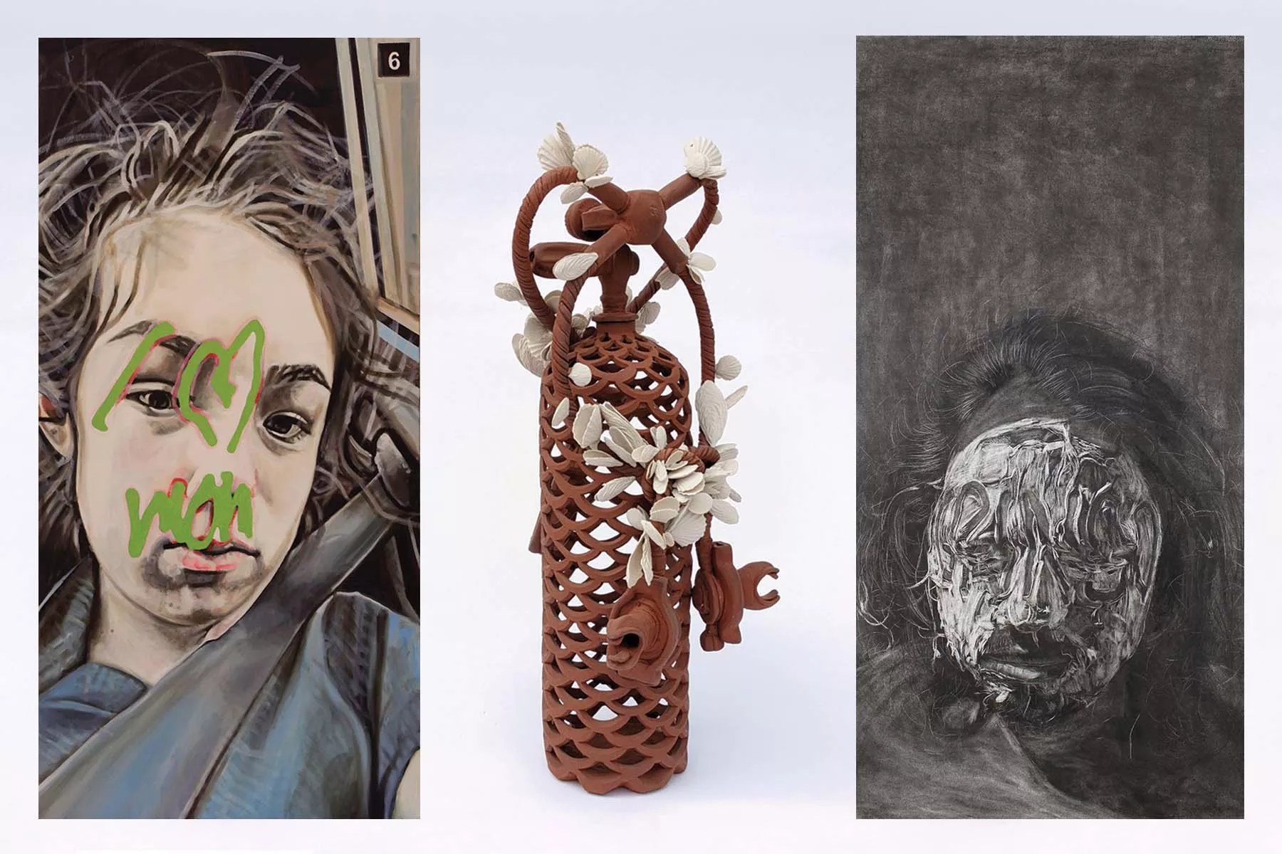 Curator Drew Austin has created a lovely exhibition for the Dairy called Vessel, which digs deeply below the surface of the word itself, understanding that art is a vessel for ideas and exploration. Viewing art always contains a certain level of personal inference, just as a functional vessel might hold water, food or flowers; Austin is asking viewers to look beyond the picture before them. The large show is actually divided into a big group effort, as well as two solos by artists Hannah Leathers, whose works tell the story of her relationship with disability, and thnhdnh, who began creating hand-embellished silkscreen prints on paper during the COVID lockdown that contain bits and pieces of his immigrant experience and memories of his homeland.