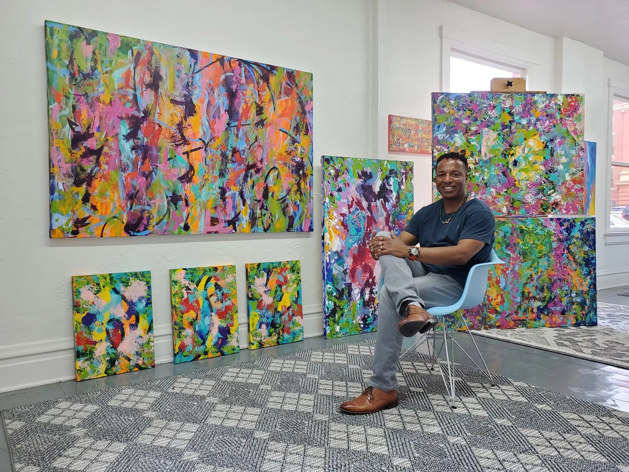 Abstract painter James-Allan Holmes shows off his large, splashy canvases on the walls of RPO Framing & Gallery on South Pearl Street. The evening will include original acoustic guitar performances by Angie Neslin of the Dominican-based band La Rafaga.