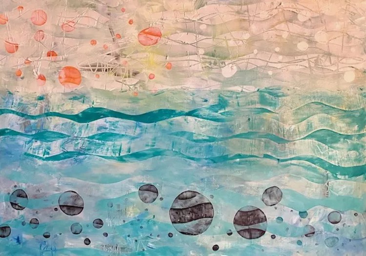 Liz Lautrup, “With the Flow Depth of Love,” collaged paper, cold wax and oil on canvas.