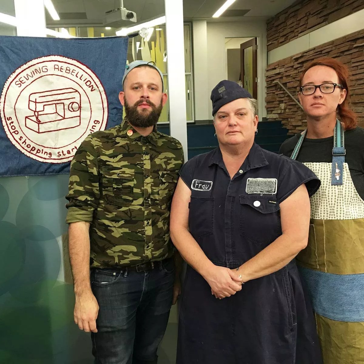 Steven Frost, Carole Frances Lung (Frau Fiber) and Jan Cole further the cause of the Sewing Rebellion.