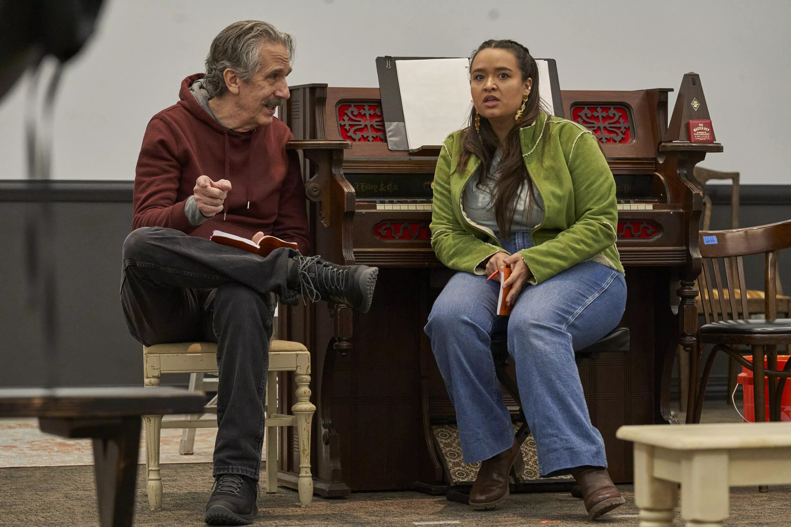 Frank Oden and Claylish Coldiron sit near a piano in the rehearsal room of the Arvada Center’s production of Our Town.