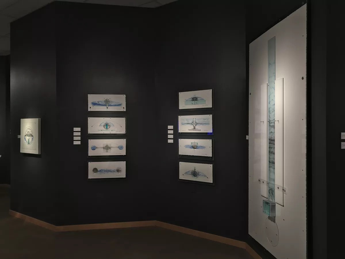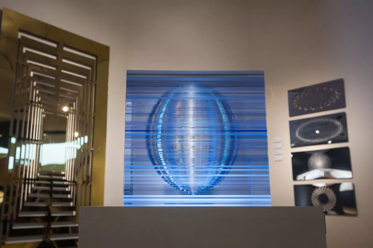 Other works also involve light and/or plastic sheets, including a series of enclosed lightboxes, each with a simple linear pattern machine-marked on the front sheet. More unusual are the pieces from Collin’s “Positive Voids” series. To make them, he stacks thin squares of clear plastic sheeting in a pile. Although the sides and the top and bottom of the stacks are solid sheets, the sheets above have been cut with internal openings so that they come together to reveal forms inside the stacks. It’s a cool effect, reminiscent of art glass.