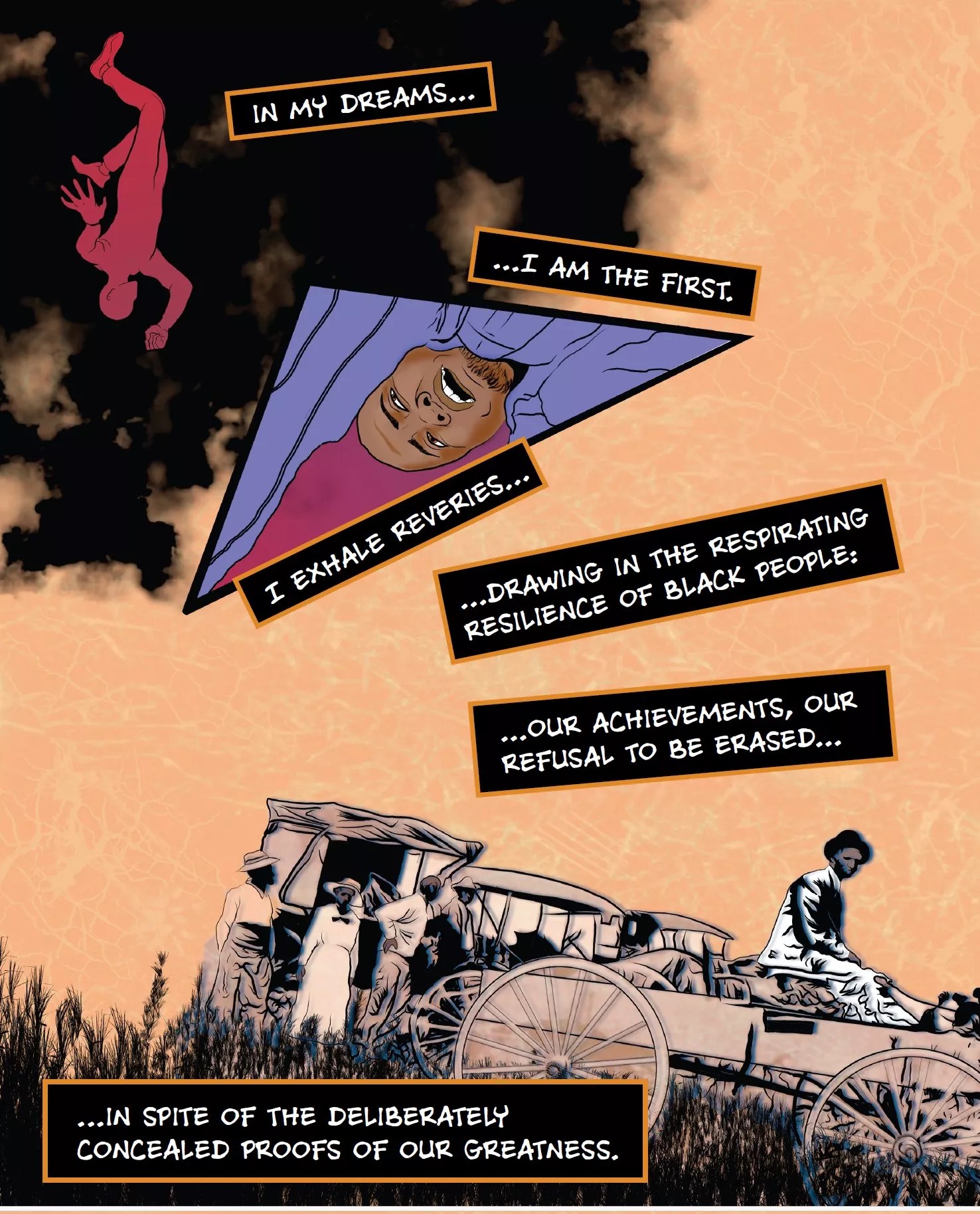 Brooks credits Denver’s Black American West Museum, which has an exhibit dedicated to Dearfield, for the idea. “I wrote and drew this story based on original photography from this historic town,” he says. “It was pretty dope.”
