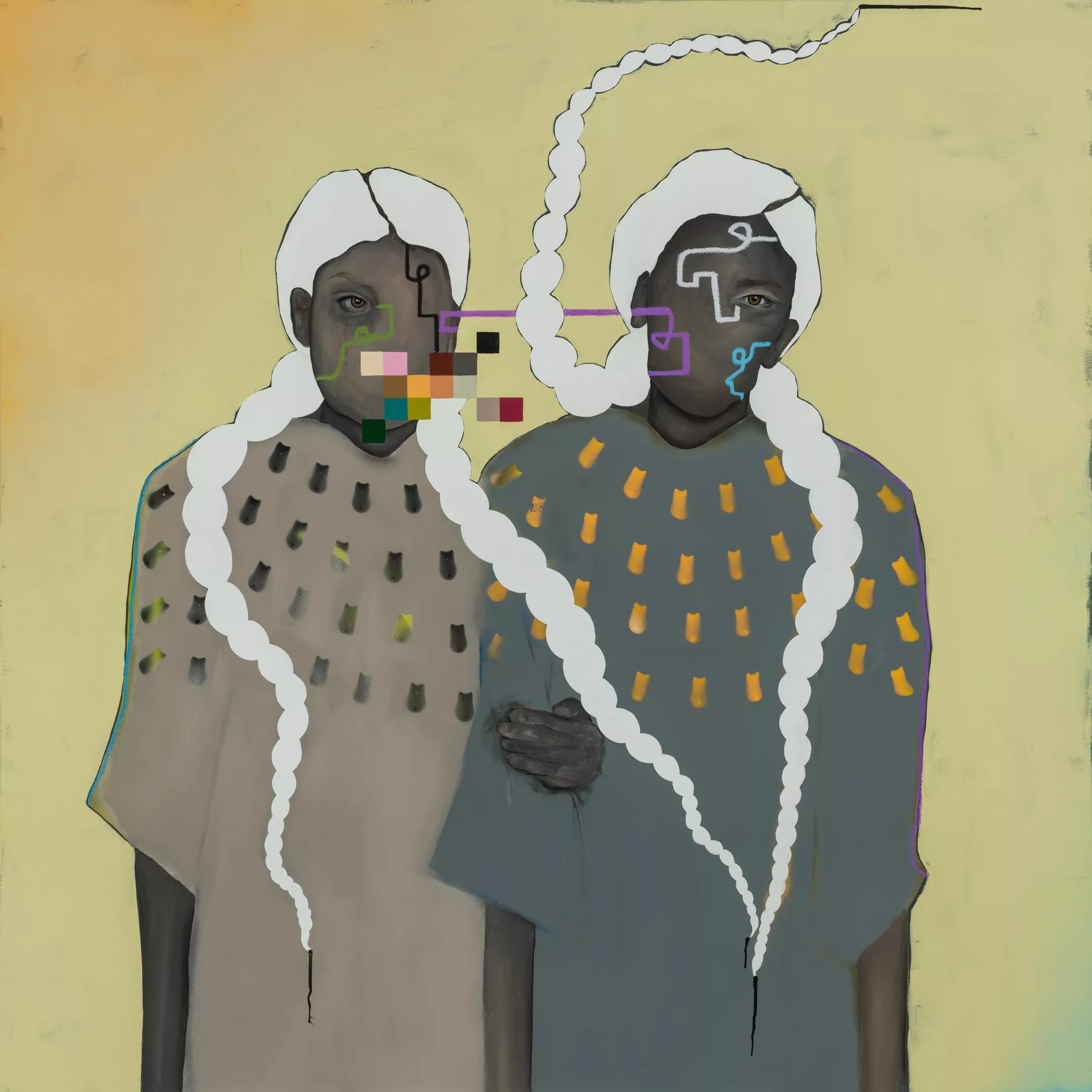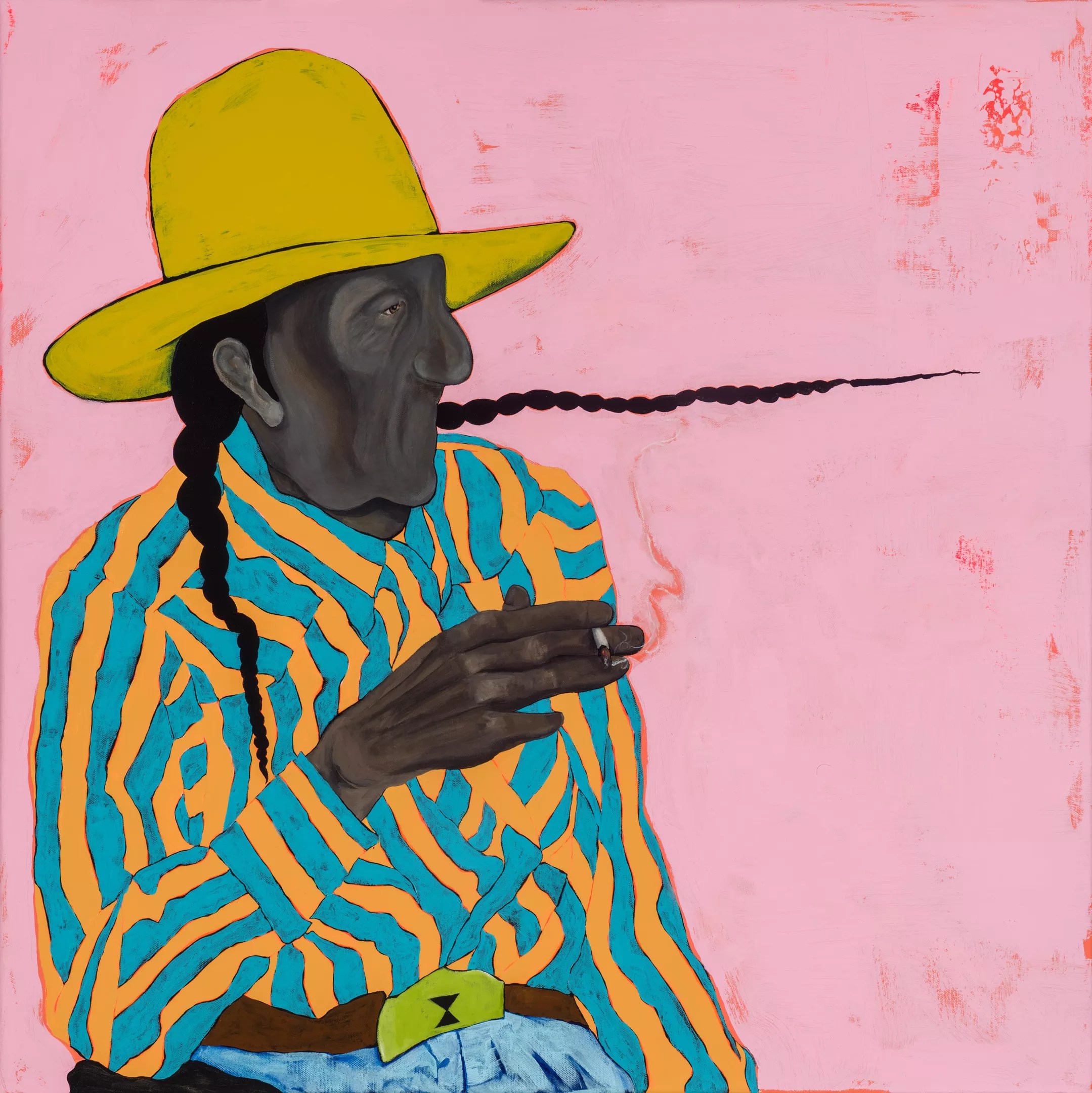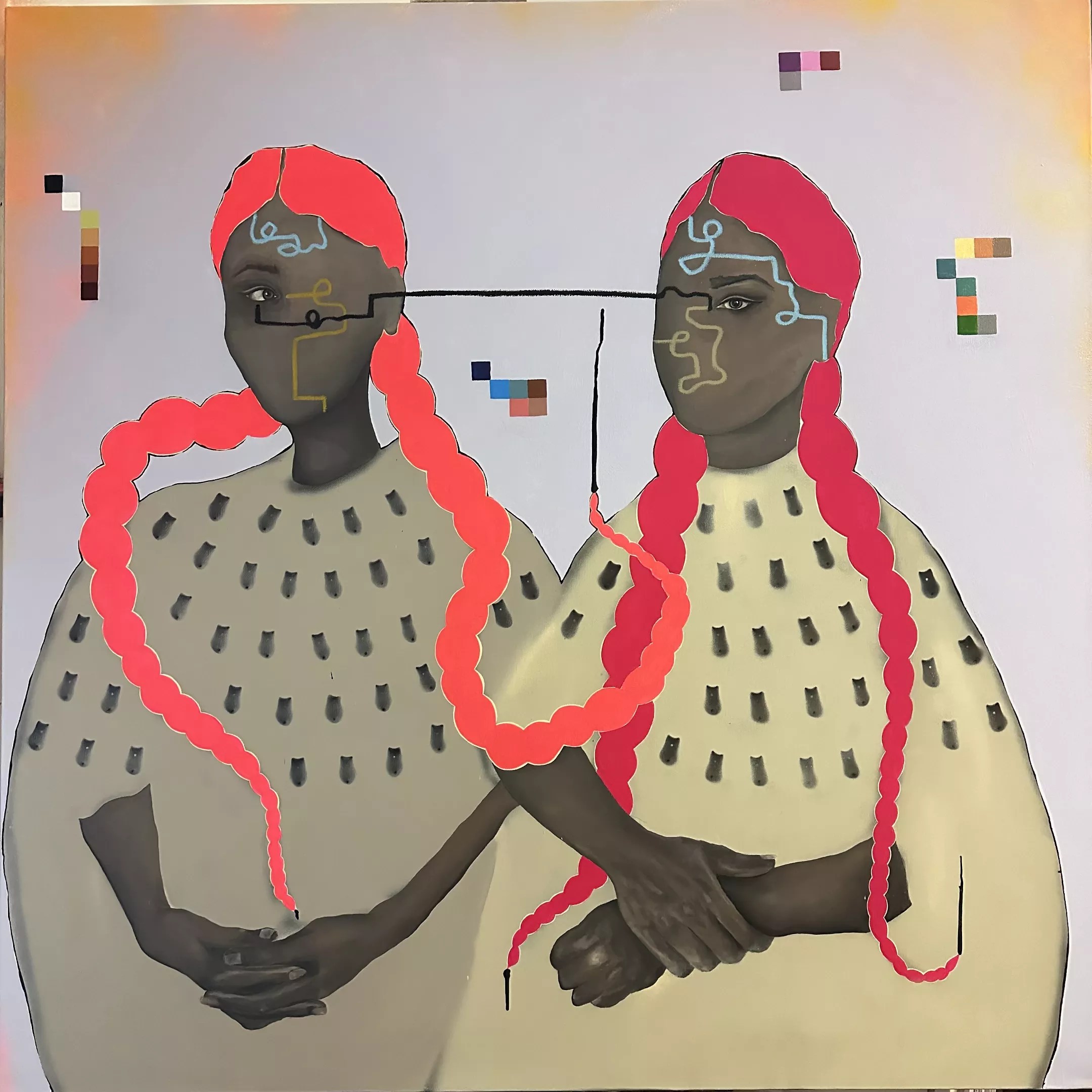 In her latest painting, “Everyone talks about having a seat but this table ain’t for us,” two women in elk-tooth dresses, their hot-pink hair braided, stand close to each other, arms tensely crossed over their bodies. One woman’s eye looks to her friend, as if asking whether she is thinking the same thing, while the other’s eye is fixed forward with a steely gaze.