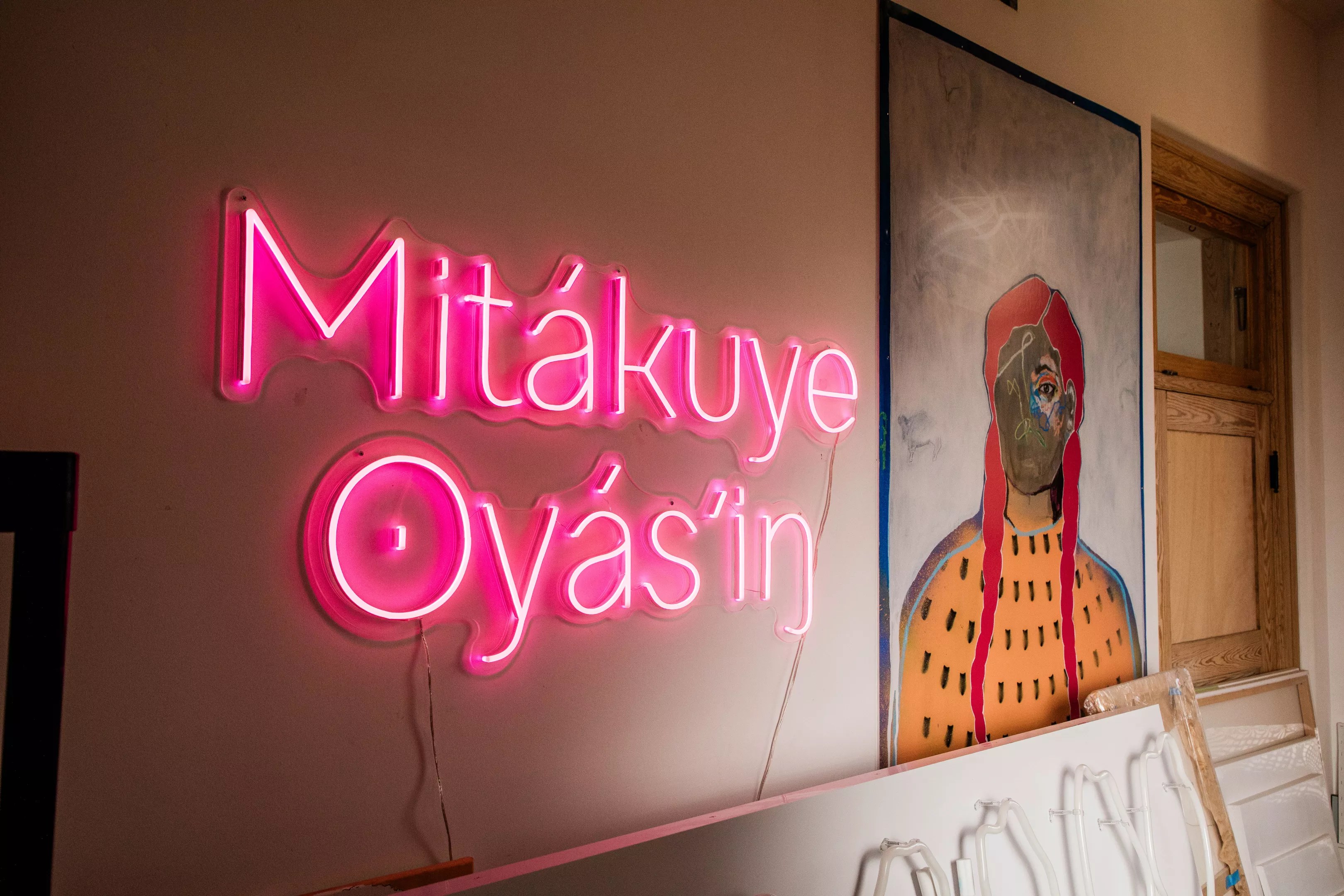 SeeWalker will have to move her studio in the coming months; it’s located inside the Evans School in the Golden Triangle, which will be redeveloped. But for now, it is filled with her multimedia works, whose motifs reference her heritage and Native history, as well as personal and historical photos that inspire her. A buffalo hide covers the floor, and her tribe’s flag is tacked to one wall, hanging above another that represents the Land Back movement. A neon-pink sign reads “Mitakuye Oyasin,” a Lakȟóta saying that loosely translates to “We are all related.”