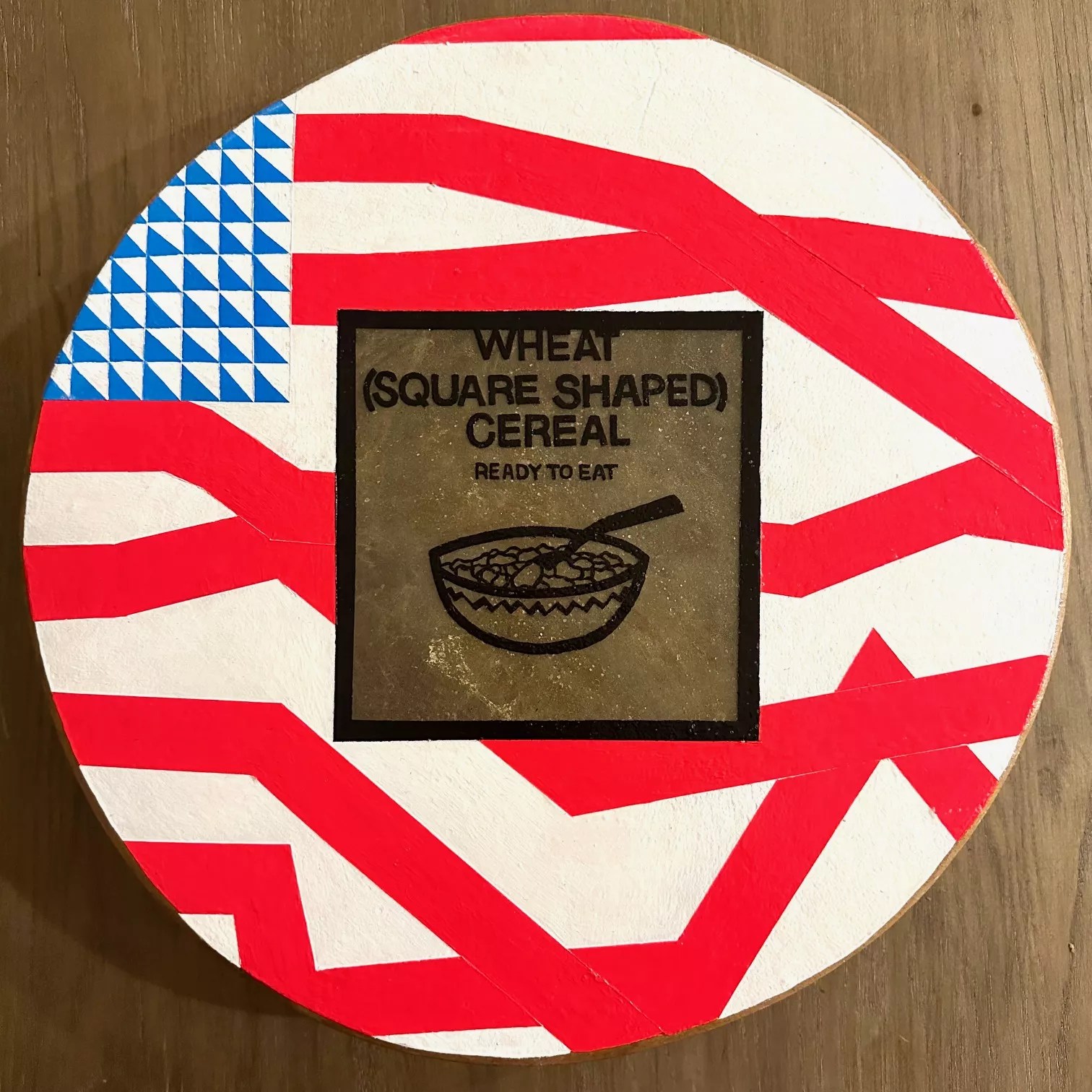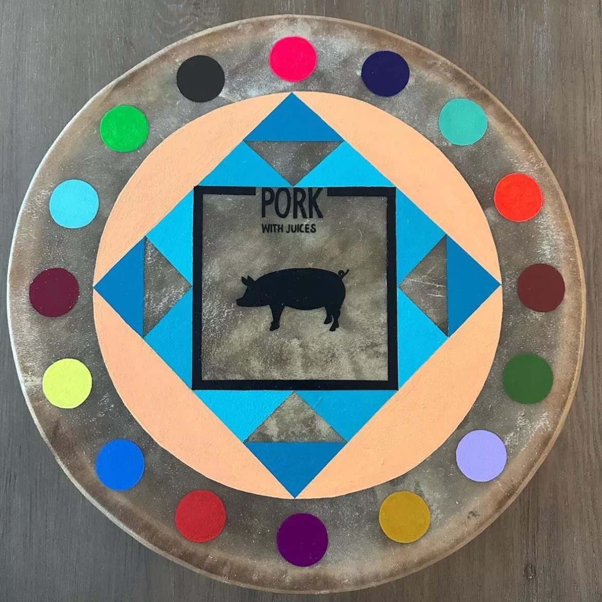 For her exhibit at History Colorado, the museum invited SeeWalker to look through its archives to find pieces that might inspire and link to her work. For some mixed-media works, she referenced historic photos of tribes lining up for food from the Food Commodity Program run by the federal government. While tribes at the turn of the century were used to relying on traditions such as hunting, now they were eating what they were given, including canned meat and dried eggs. SeeWalker decorated drums with colorful symbols surrounding the labels on such provisions — “Pork with juices” above the silhouette of a pig, “Wheat (square shaped) cereal — Ready to eat” above an illustration of a cereal bowl.