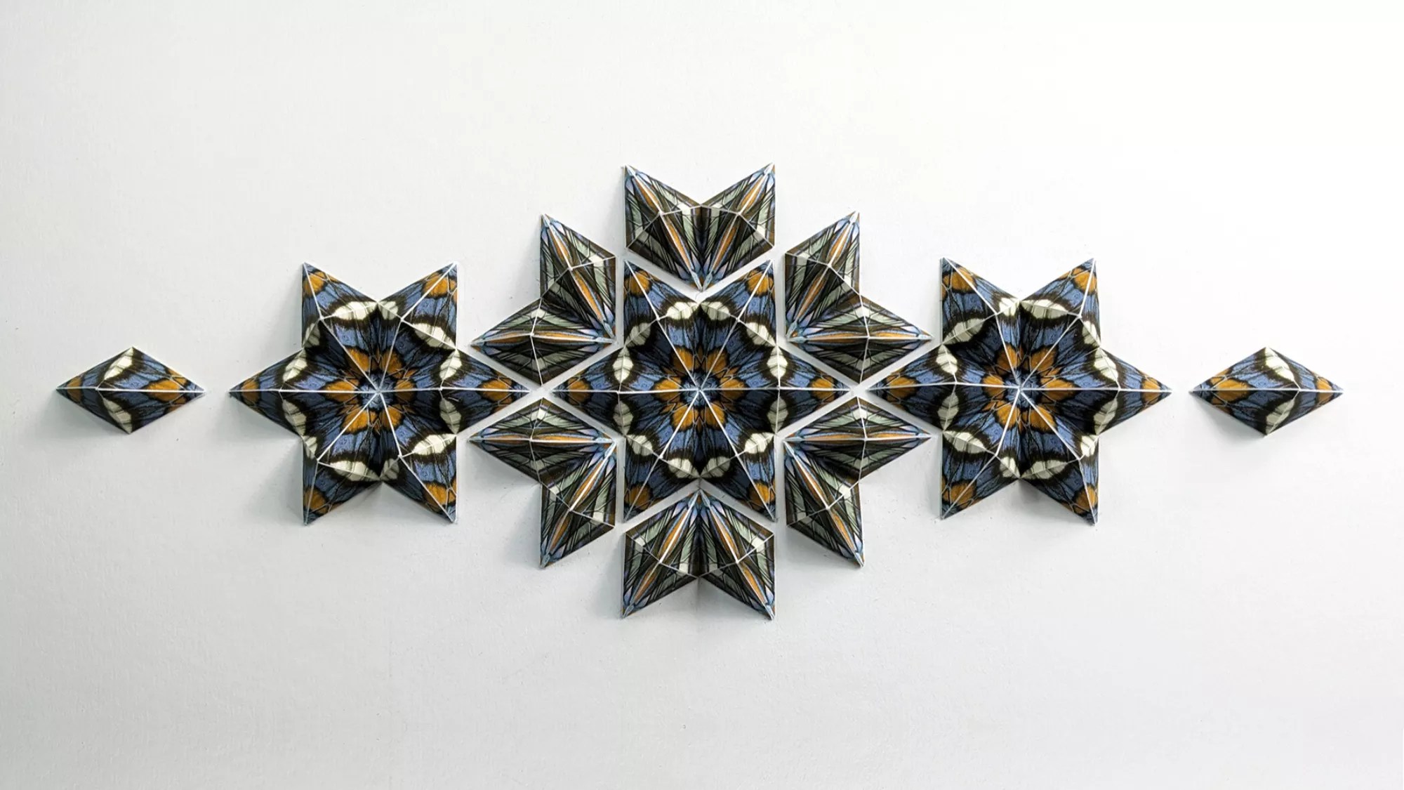 For Lauri Dunn, there is no such thing as a homogenous image of a butterfly wing. She looks for patterns, texture and colorful pictures designed by nature while preparing to integrate them into sculptural works. Whether these images end in a single photo or as several folded up together into origami-like structures, Dunn presents their natural beauty in kaleidoscopic shapes and colors, finishing them off with metallic resin.