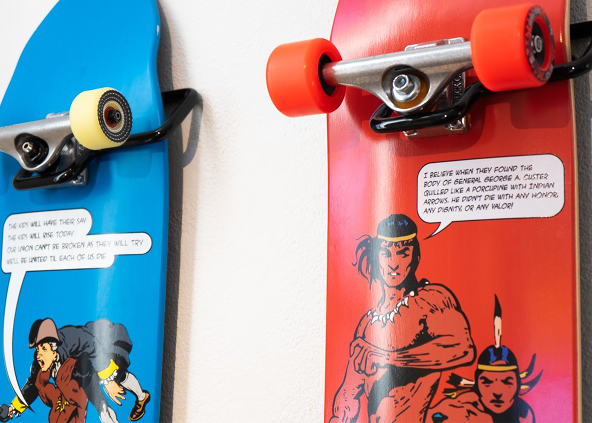Other artists broadening representation in intriguing ways include Nanibah Chacon and Liz Cohen, as well as Indigenous artists Gregg Deal and Douglas Miles. Chacon and Cohen provide representations of women in what is often the “boys’ club” of lowrider culture, while Deal and Miles lead viewers into discussions about the stolen Native land that lies under a skateboard’s wheels. There’s a lot to take in, but Desert Rider treats its serious subject matter in ways that are both playful and empowering.