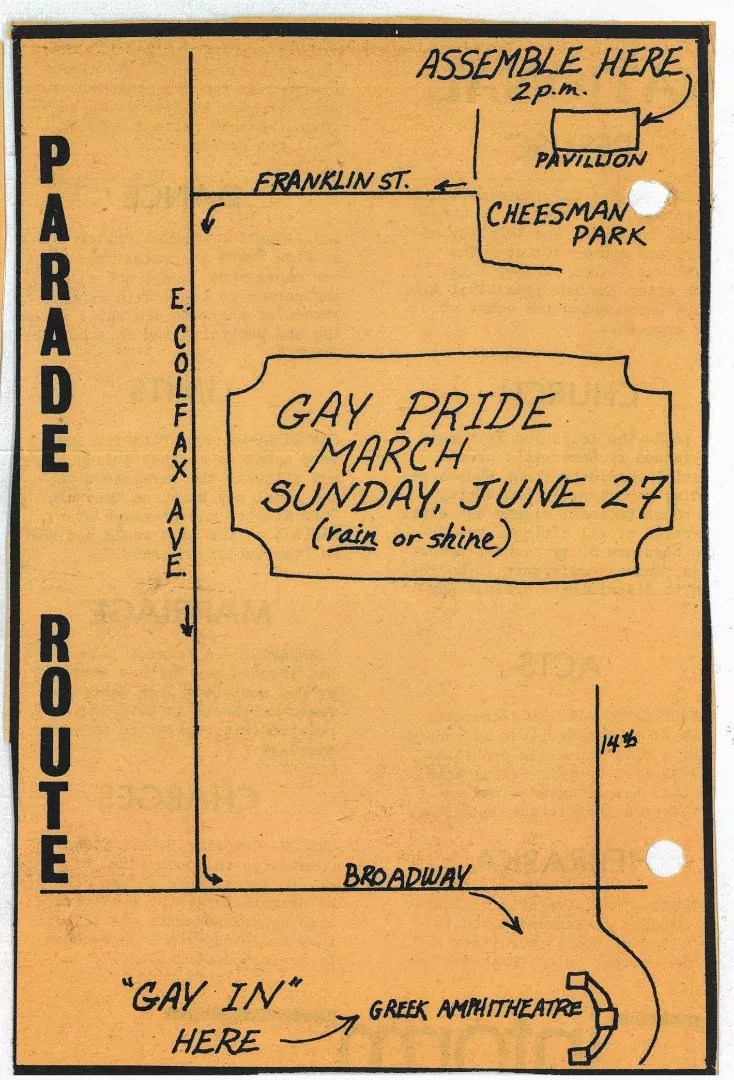 The first Pride parade marched from Cheesman Park to Civic Center.