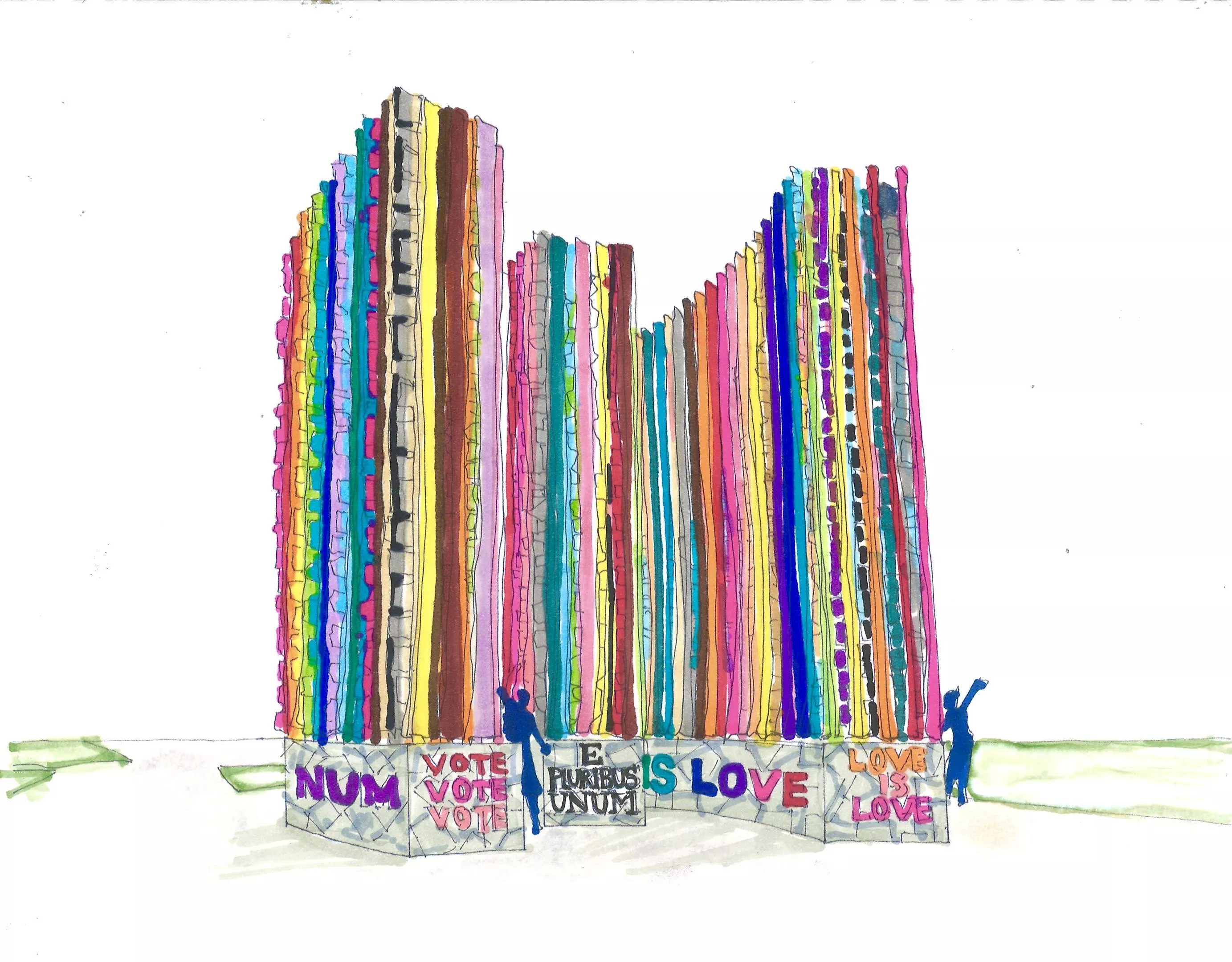 As he looks over the colorful, splashy renderings for E Pluribus Unum, Hanzon picks up a copy of the Mary Oliver poem and reads it. “I haven’t seen anybody not cry” when reading the poem, he says. “Because we all have that vulnerability. We all have that ‘otherness.’ And as long as that ‘otherness’ exists, we need to unify.
