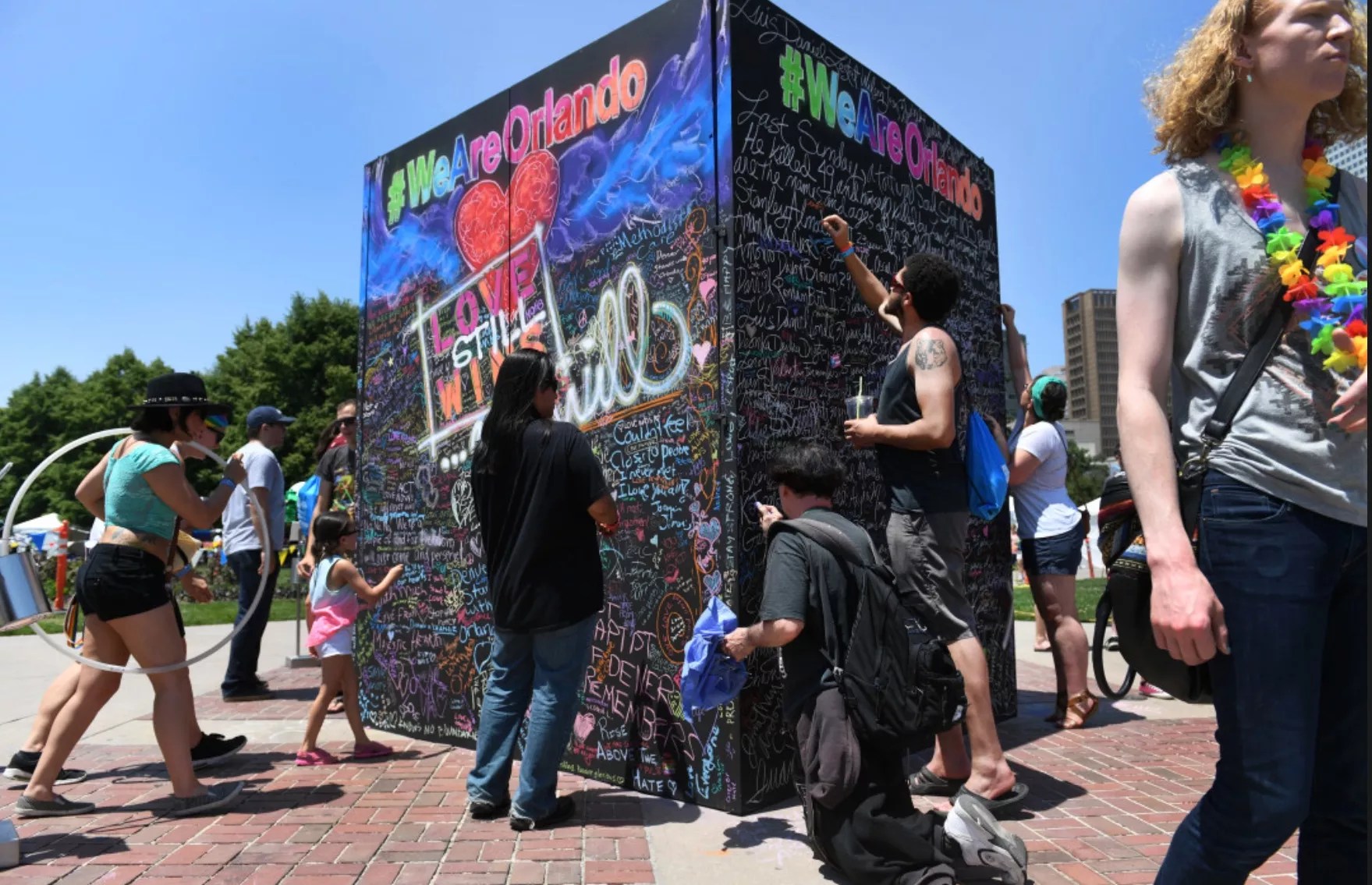 His 2016 installation also reflected a timely issue…but instead of anticipating a celebration, it mourned a tragedy. The mass shooting at the gay club Pulse, in Orlando, Florida, happened just four days before Denver’s festival. The massacre killed 49 people, and a heavy police presence loomed over the Mile High event — a reminder of very real threats the community faced.