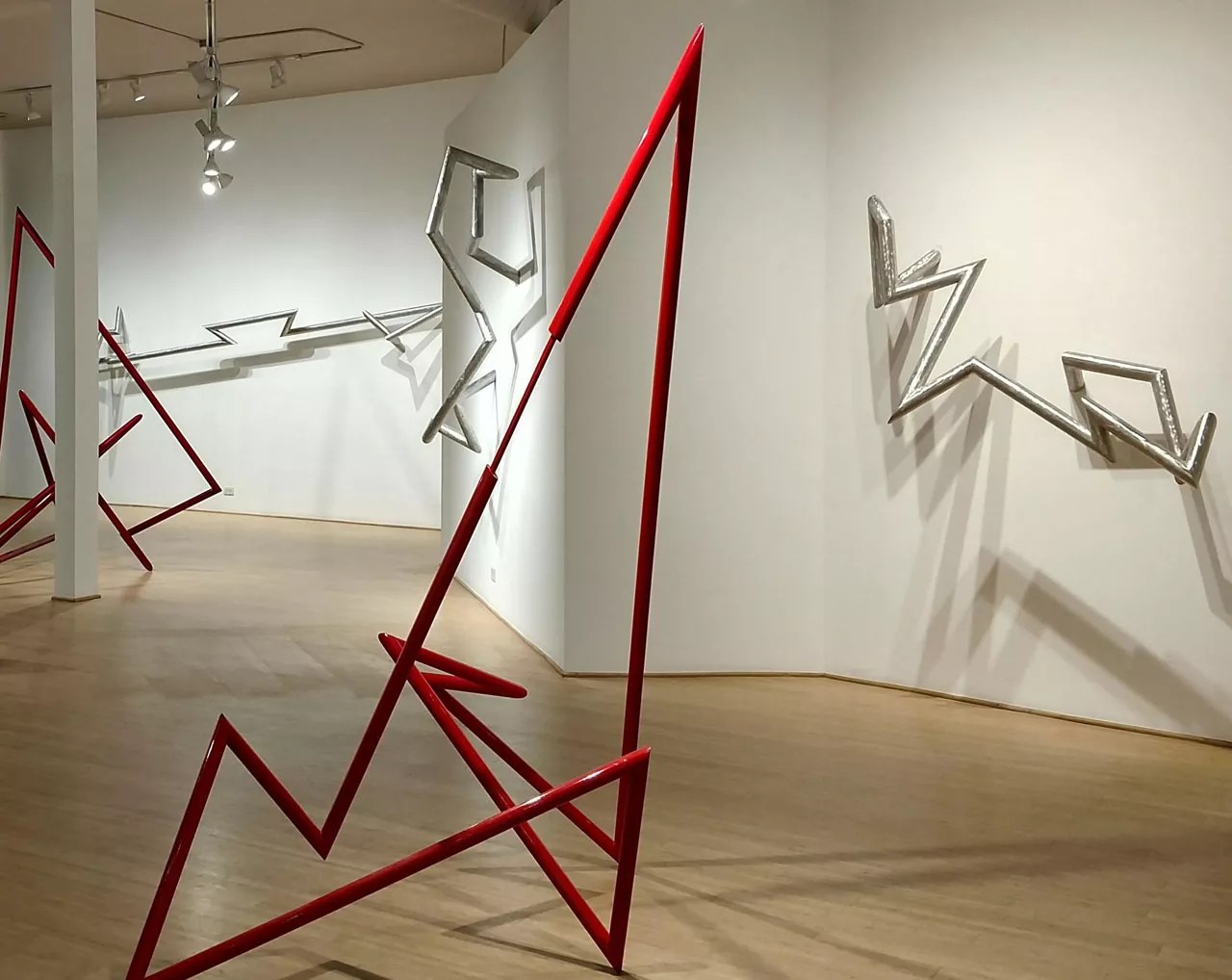 Mangold’s most readily recognizable sculptures are his “Anemotive Kinetic” whirligigs. The Anemotives are made of colored scoops on wire arms that take on overall spherical shapes and twirl as the wind catches them. But his pieces were always about movement, whether the sculptures actually moved or simply evoked movement while static. The latter type are on display at Michael Warren. All from the “PTTSAAES” – Point Traveling Through Space At An Erratic Speed – series that he’s been working on for several years. Using tubular steel or tubular stainless steel, Mangold cuts and welds the metal in imaginary representations of the trajectory of particles traveling through space. The steel ones are powder-coated in different colors; the stainless-steel ones are scratched and polished. The tubes zig, zag and reverse on one another, suggesting to the viewer that these fantasy particles are running into phantom obstacles that cause them to change course repeatedly. Some, like the wall reliefs, evoke bolts of horizontal lightning; the floor pieces are more like tents.