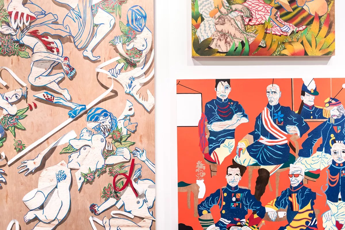 In many ways, the pieces in the eye-popping Diego Rodriguez-Warner: Honestly Lying are the polar opposite of the Petersons. Rodriguez-Warner’s complex forms contrast with Peterson’s reductive handling of the figure. There’s a big divergence in palette, too, with Rodriguez-Warner’s riot of toned-up shades creating a striking juxtaposition to Peterson’s quiet hues.