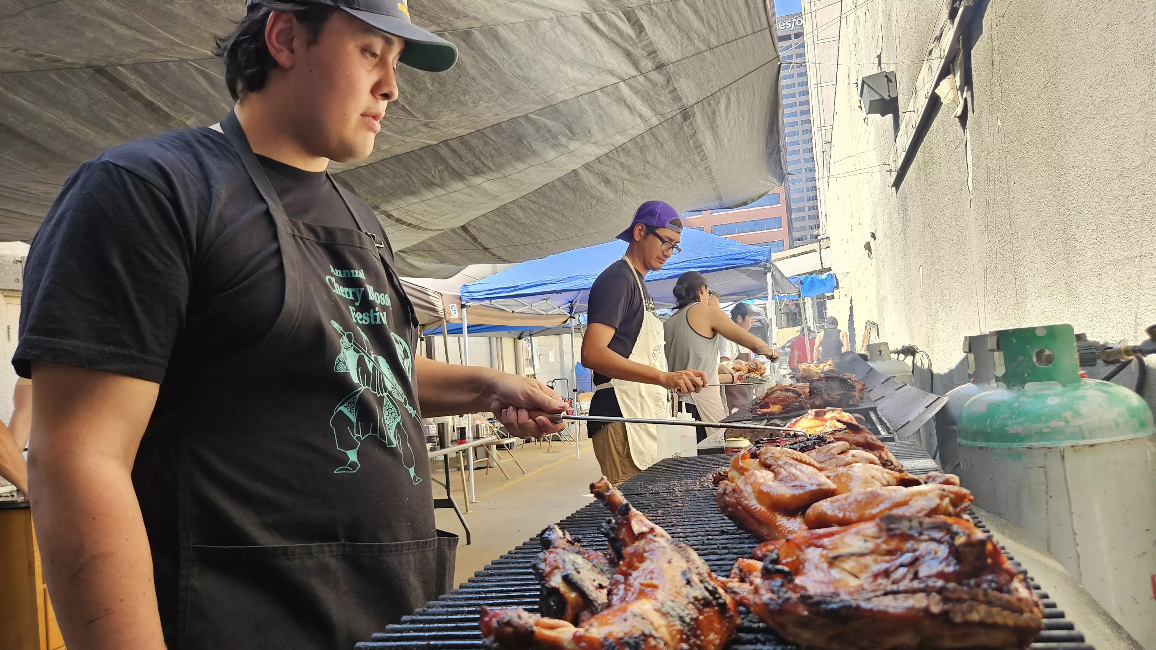 Behind the scenes, volunteers grilled 3,100 pounds of chicken and made rice in 77 rice cookers to satisfy the crowd’s appetite for the food at the temple.