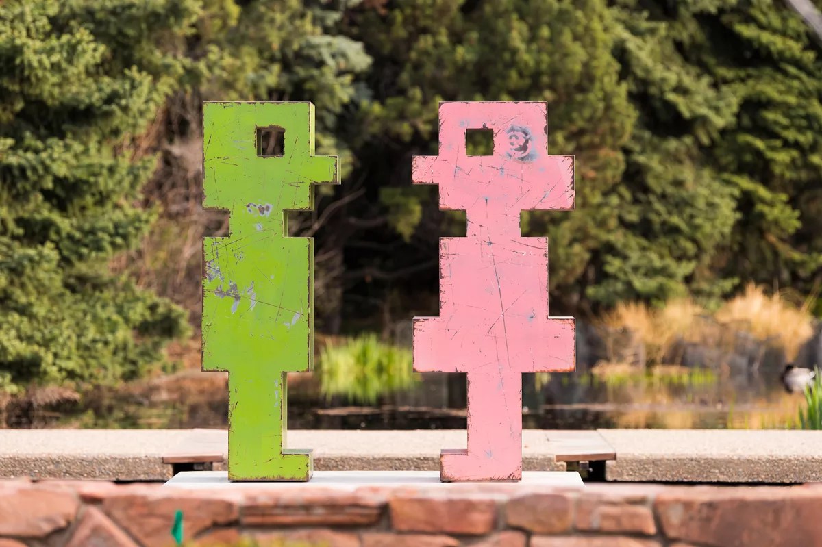 “Pinkie” and “Mr. Green,” by Mike Whiting, steel and automotive paint.