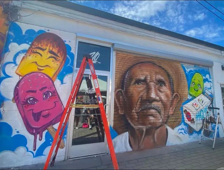 “He was very uplifting in a lot of ways,” says artist Chelsea Lewinski, who met Maes in 2019 before becoming a close friend and collaborator. “I was just an emerging artist when we met, and he was one of the first people to encourage me and tell me how incredible my art was. The collaboration we did that I love most is a mural at Denver Central Market. We decided to paint the paleta man. At the time, paleta men were getting jumped and beaten, and they’re a very big part of our culture. So we wanted to honor the paleta man who walks around the neighborhood. We painted an older Mexican man who represented the paleta man, and then Markham painted cartoon popsicles all around him.”