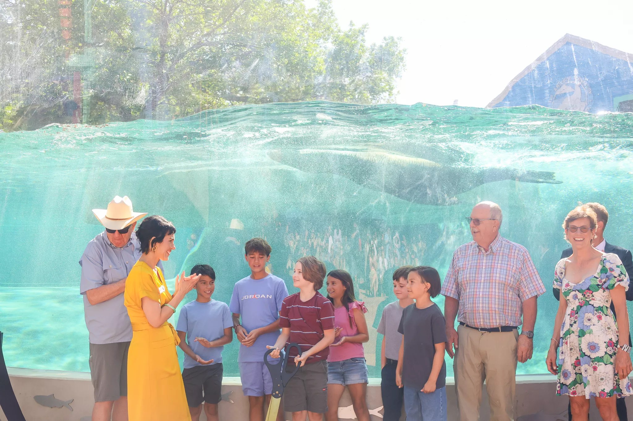 People stand by the new sea lion viewing window.