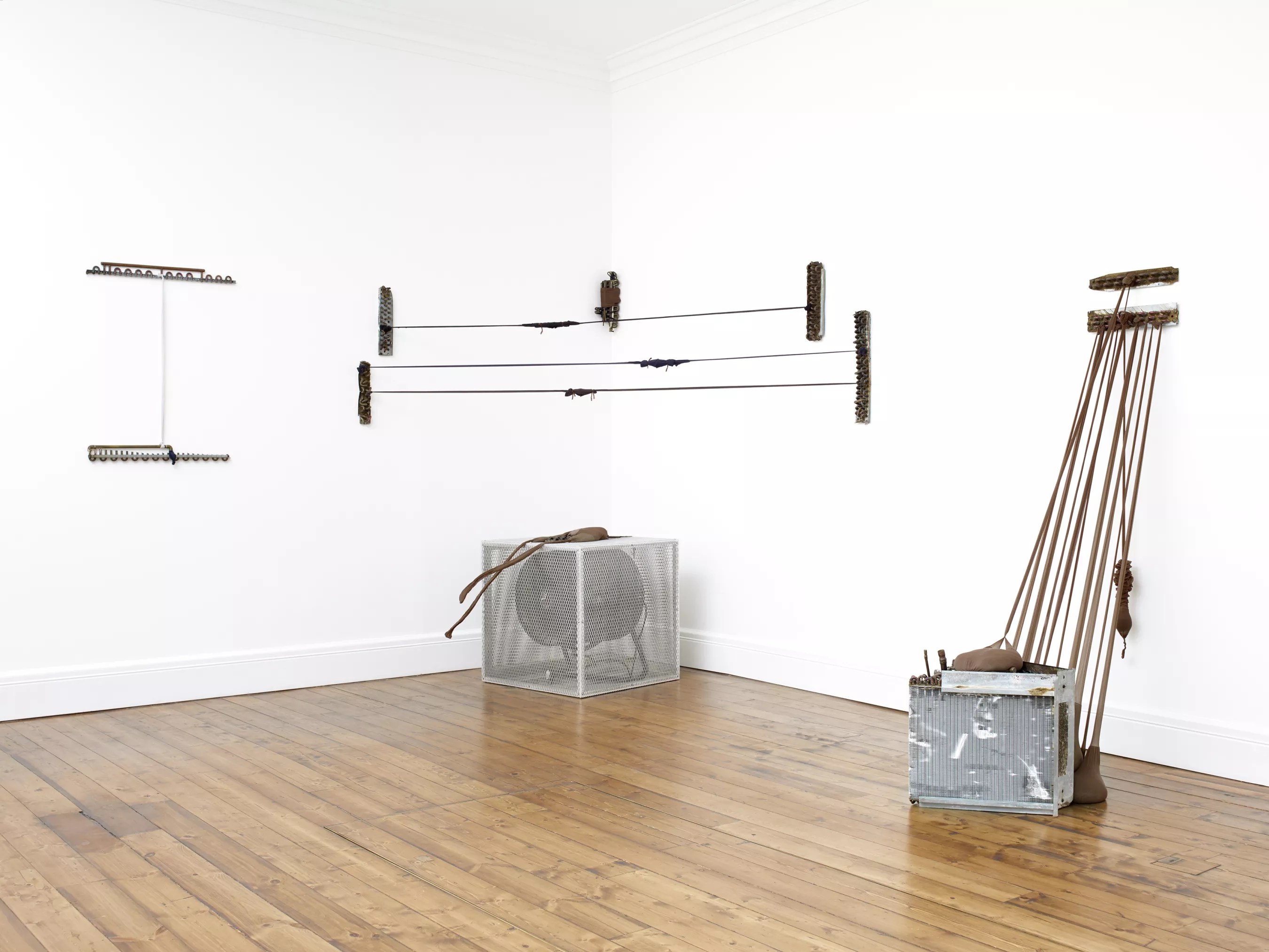 The works from the A.C.Q. series, which were shown at the Venice Biennale in 2017, also explore the concept of materials in tension and include found objects. One of these installations was recently acquired by the DAM and will be included in the retrospective, as will the photographic triptych “Masked Taping,” which documents a performance.