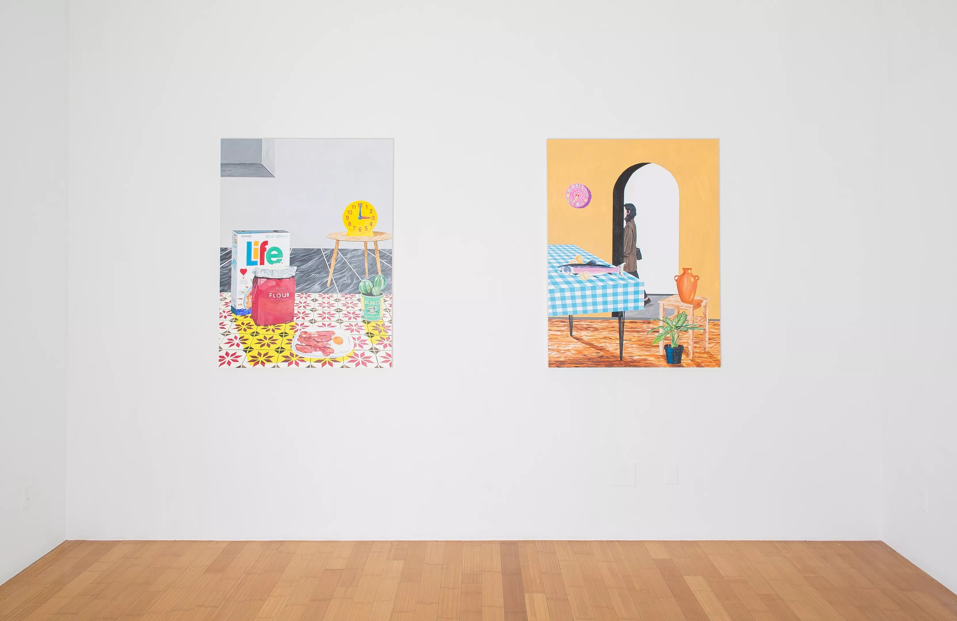 In addition to pog-prompted paintings, there’s a suite of odd installations that culminates in an assortment of found objects, including actual pogs, pog cases and a black light leaning against the wall, with an inverted drawing above it and off to one side. This accumulation is hidden behind “Ghost in the Shell (Entombment of a Machine),” a digitally woven tapestry with the image of an Asian magazine cover stretched over a wooden frame, set out at an angle from the wall. The tapestry includes a representation of an eroticized robotic woman surrounded by Japanese characters and a smattering of English words. The threads used to create the imagery result in a faded palette, not unlike an actual cover that’s been cheaply printed. “Breakfast” (left) and “June 7,” both by Sierra Montoya Barela. Photo by Matthew Pevear courtesy of David B. Smth Gallery