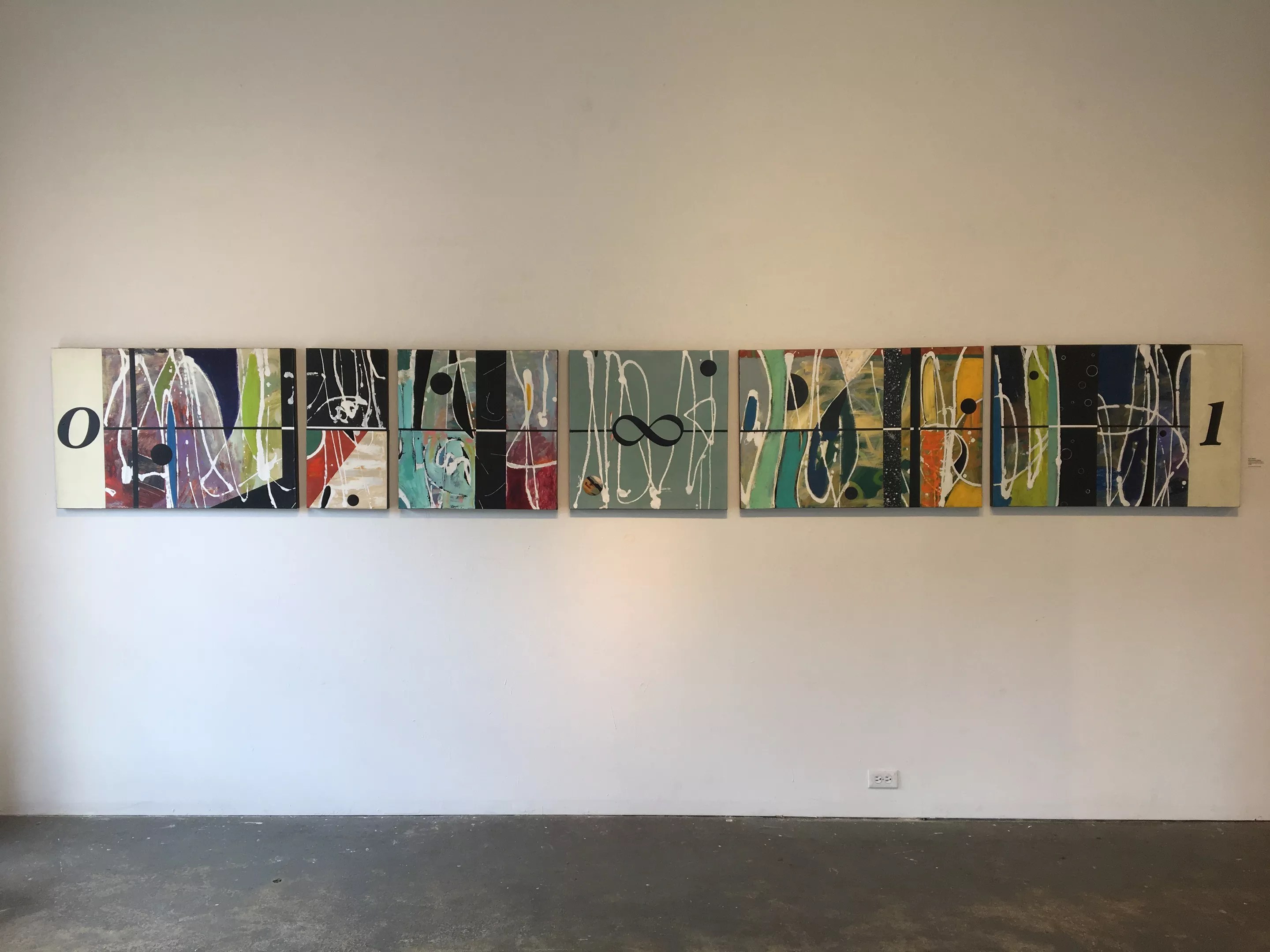 The tone of the show is set by a single monumental work, “Uncountable Infinity,” that takes the form of an exaggerated horizontal, comprising a number of panels of differing widths and the same height, so that they can be lined up. The panels are covered in all-over abstracts with atmospheric grounds and linear elements. Running the length of them is a graphically bold horizontal line that changes from black to white depending on the colors of what’s behind it. At one end is the numeral zero and at the other the number one, with the infinity symbol in the middle. The piece is meant to represent the idea that there are an infinite set of fractional numbers that exist between zero and one, and it really works. “Uncountable Infinity,” from Sue Simon: Numbers. Robert Delaney
