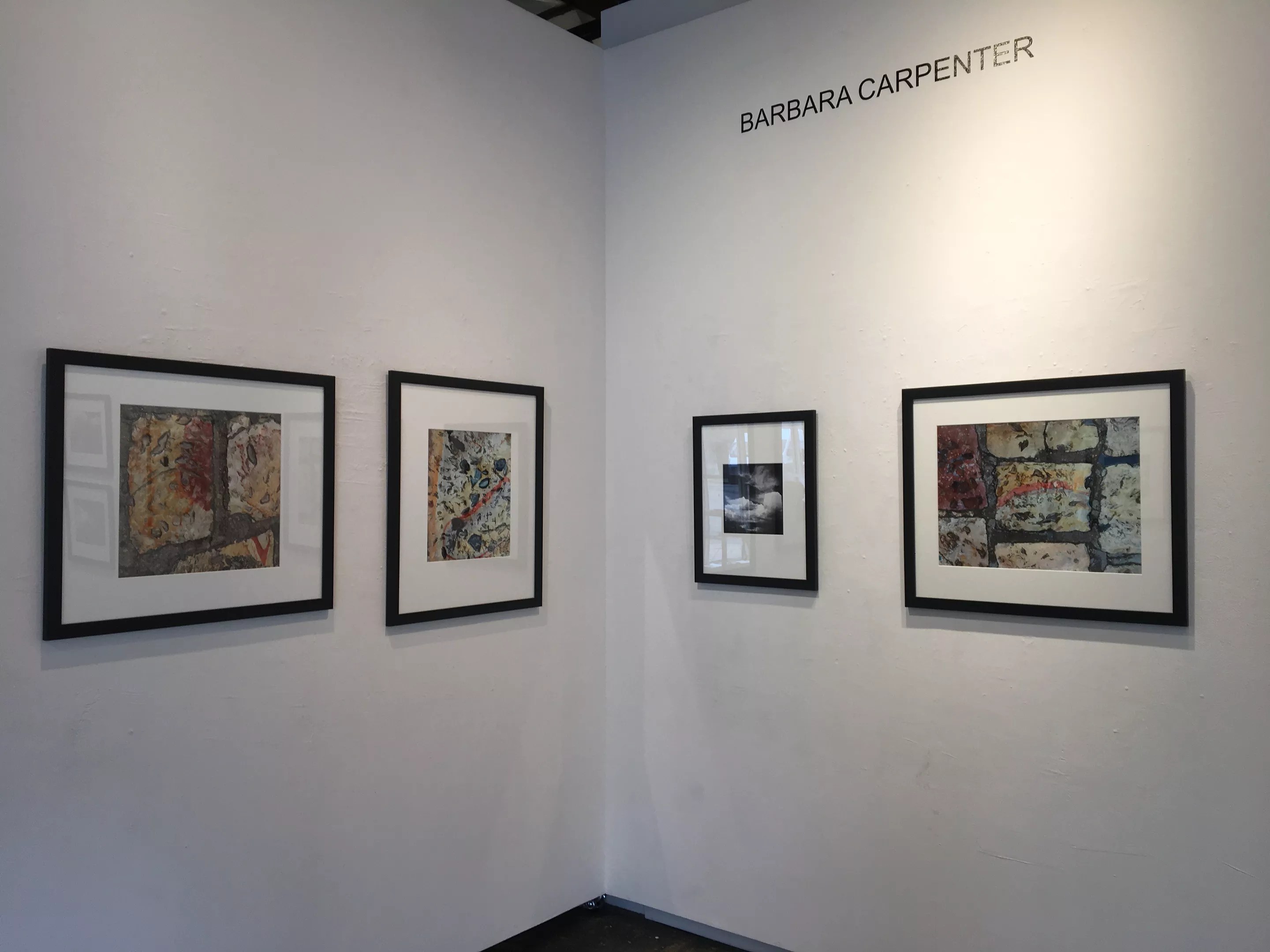 In the adjacent east gallery is Barbara Carpenter: Over/Under, with photos of clouds (the over part) and pavement (the under), which have been taken with an iPhone and presented in digital prints. While the cloud photos don’t look like signature Carpenters, the pavement pictures do. Traditionally, Carpenter has created “found” abstracts by photographing something, such as scrap metal in a junk yard, and closely cropping her view to remove it from its context and thus make it into a non-objective composition. The cloud pictures, though technically “found” abstracts, are clearly depictions of the actual sky. But the pavement photos lose the recognizability essential to the idea of a found abstract, instead melting into roughly geometric constructions in mottled earthy tones. These advance Carpenter’s previously expressed ideas, while the clouds seem to indicate a whole new direction.