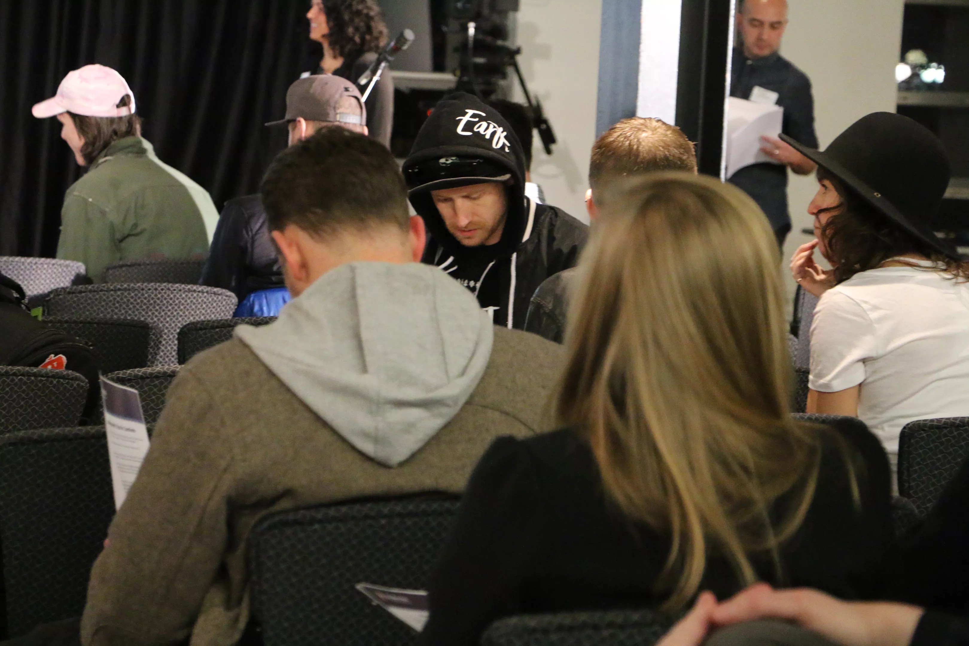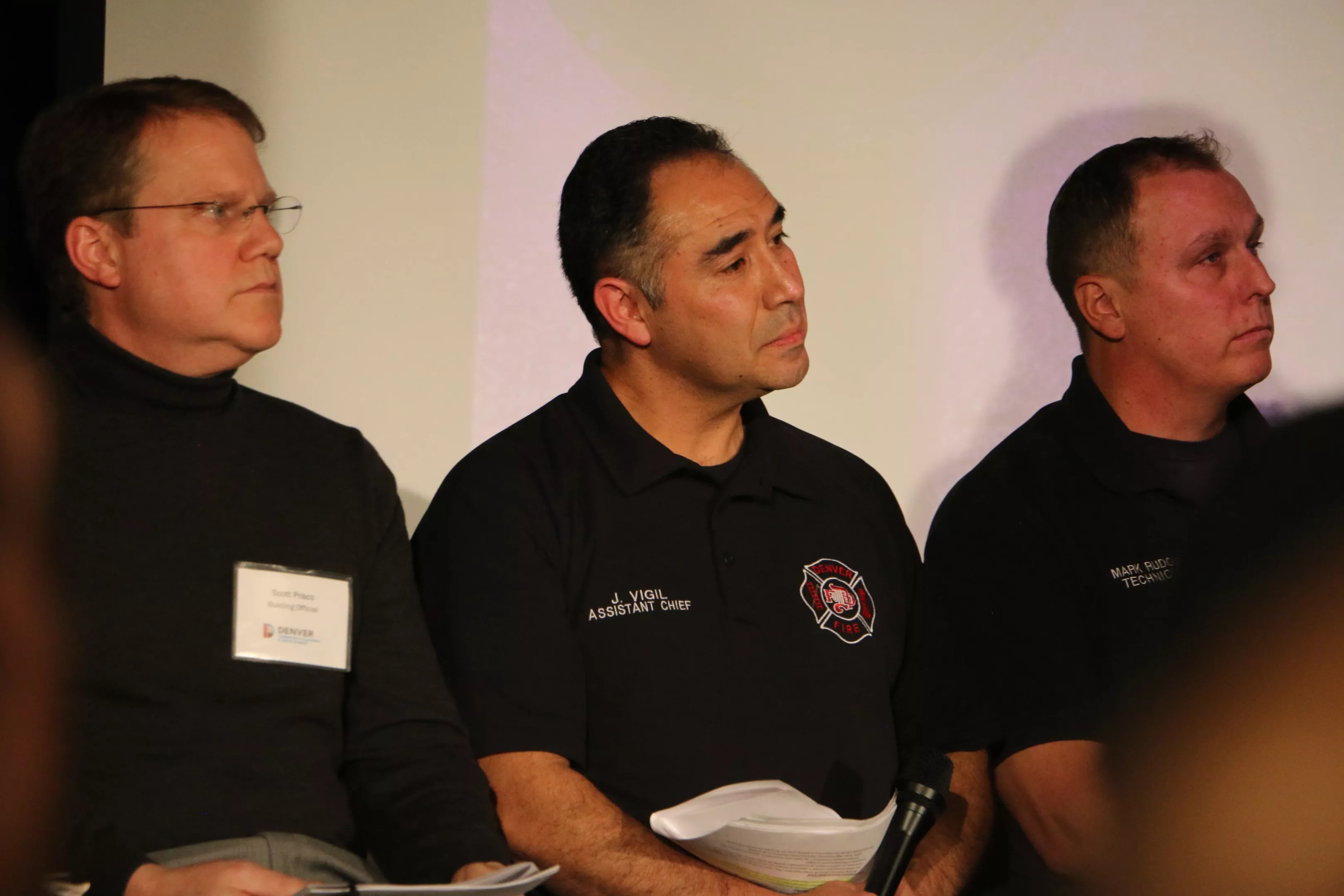 Scott Prisco, a building official with Denver Community Planning and Development, Jeremy Vigil, assistant chief of the Denver Fire Department, and Mark Rudolph, a fire department technician, listen as representatives from DIY advocacy group Amplify Arts Denver talk about why the DIY scene matters.