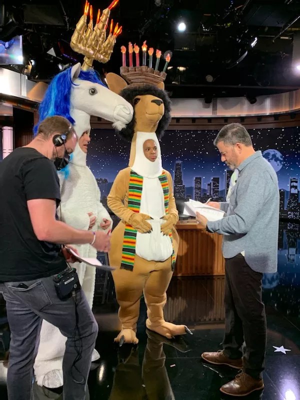 Individual jokes are hard for me to say because you write so many that it’s kind of like sending them off and letting them go, you know? I think. My favorite bit that I got to co-write and be a part of was the Kwanzaroo. We do this bit every year called the Chanucorn, which one of the head writers, Gary Greenberg, created a long time ago. It’s basically this mystical Hanukkah unicorn, and then the gag is basically that he interrupts Jimmy in the monologue at some point during Hanukkah every year and Jimmy’s like, ‘The Chanucorn is not real; Gary made up this dumb thing.’ For my first Hanukkah in 2021, I pitched the idea of the Kwanzaroo interrupting the Chanucorn’s yearly appeal to Jimmy with another, totally real holiday character based around Kwanzaa. Gary and I worked together on that, and I had a lot of fun performing in that one. … The coolest thing, among many, that I’ve gotten to be a part of since I started working at the show was, of course, getting to write for the Oscars. I’ve been a movie fan my entire life, so getting to be a small part of Hollywood’s biggest night is, of course, an incredibly surreal, once-in-a-lifetime experience that I only got to have because I’m lucky enough to work at Jimmy Kimmel Live!.