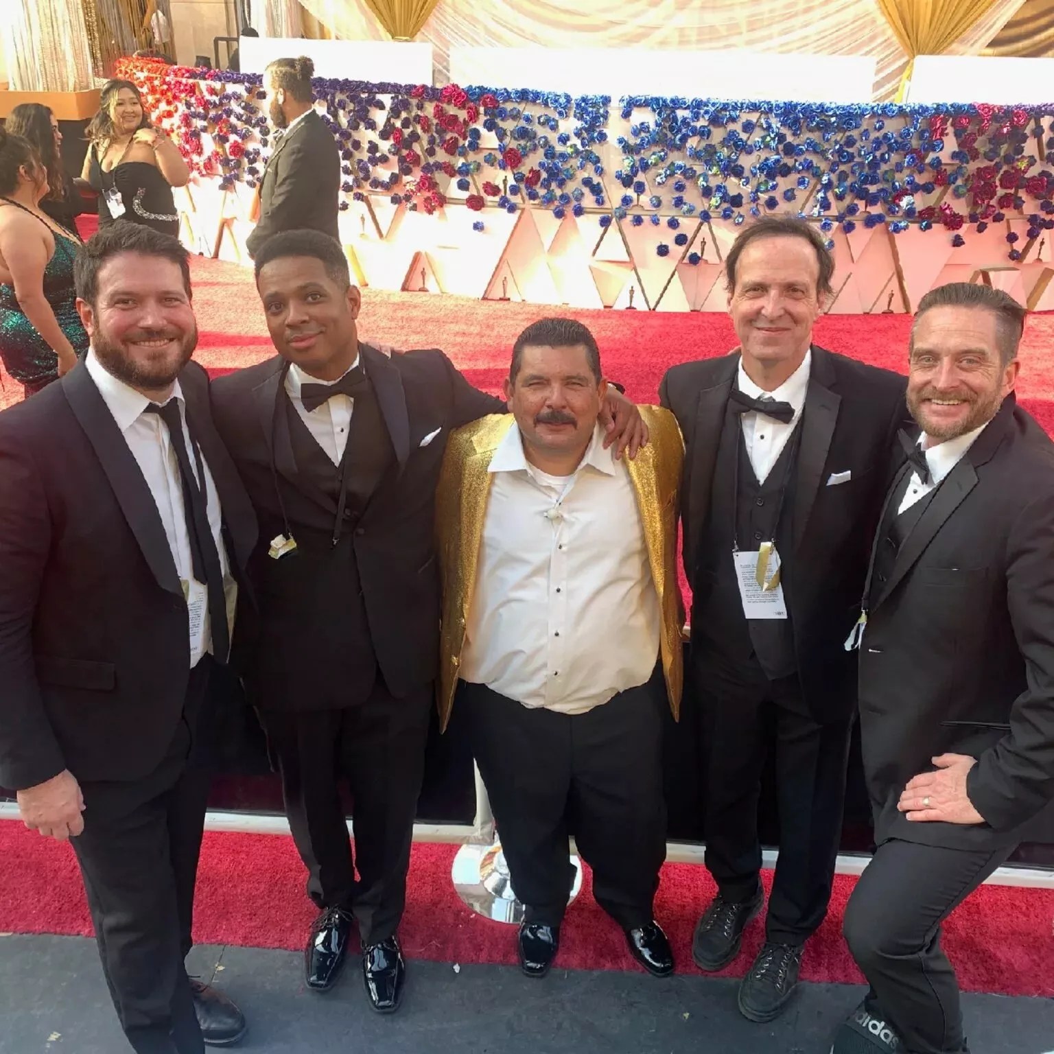 Troy Walker poses with Brett Saxon, Guillermo Rodriguez, Todd Jean Pierre and Steve Garrett, his Kimmel “comedy family,” at the 2022 Academy Awards.