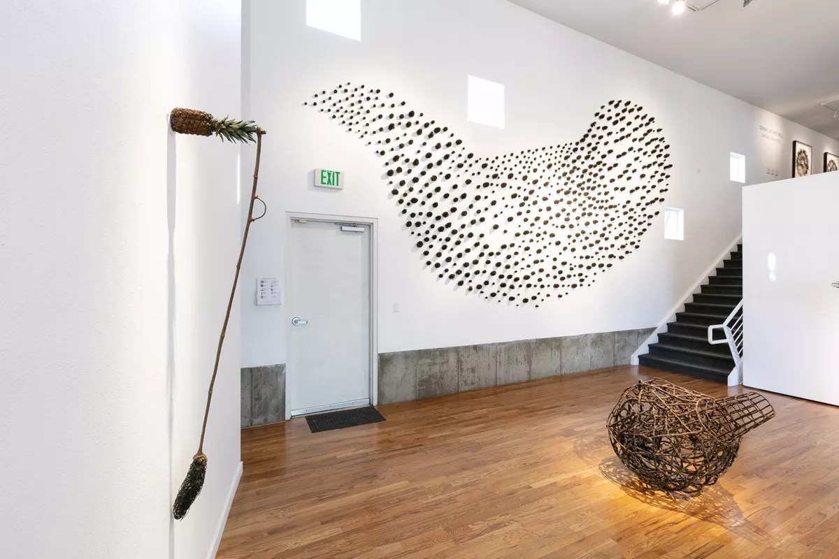 One of the first pieces that catches the eye – both for its size and its complexity – is “1000 Prayers,” a wall installation made up of 670 individual bronze casts that flow over the wall, rising way overhead. Each of these casts is an unbelievably realistic rendering of a pine cone, and each is unique, since the molds are destroyed as part of the process. Gallery director Bill Havu pointed out that as Saito has arranged them, the pine cones resemble a murmuration of starlings, because the cones seem to be turning in on themselves. Another sprawling wall installation, “Fish Net,” is installed on an adjacent wall.