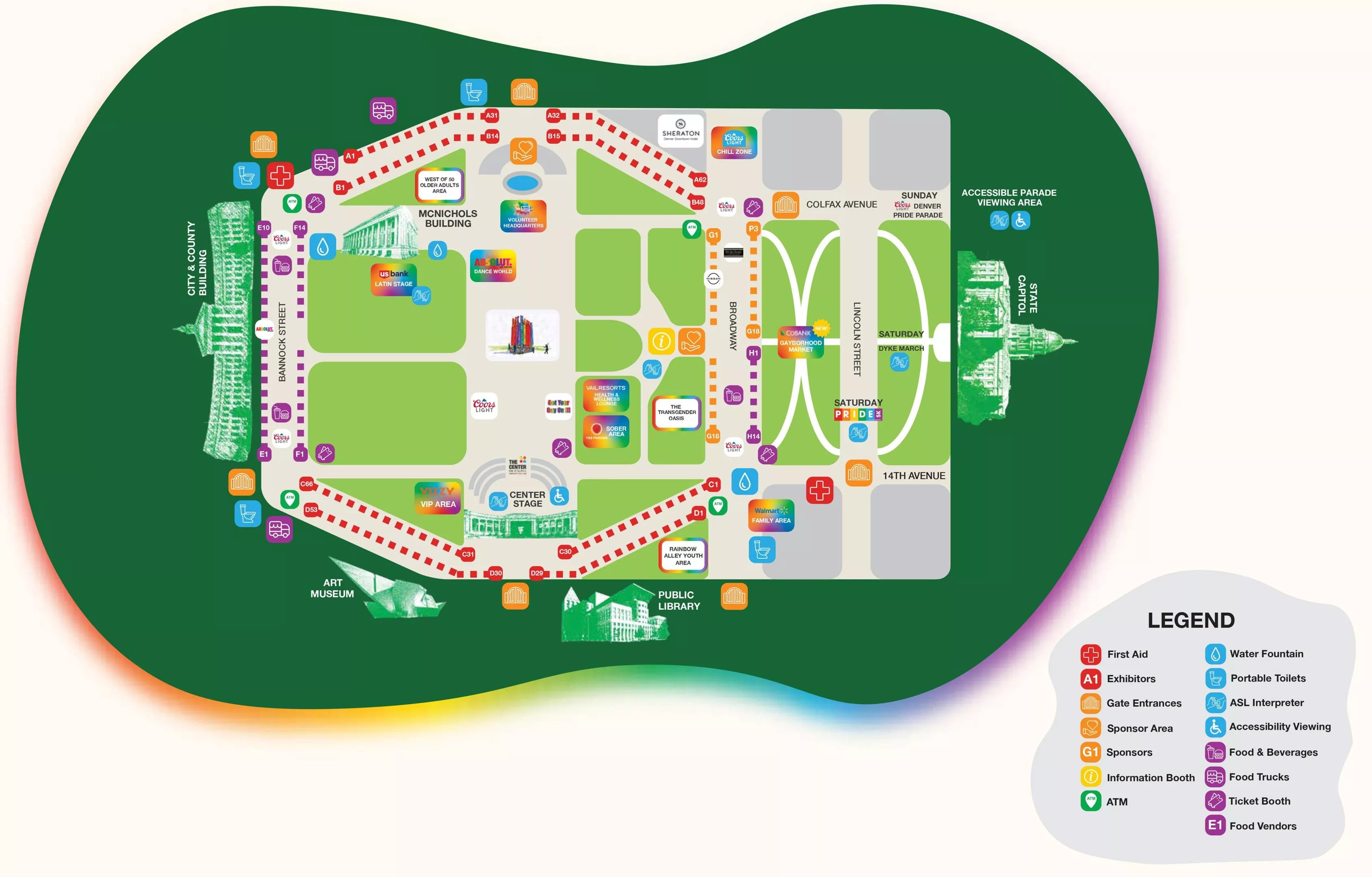 The Coors Light Denver Pride Parade on Sunday, June 23, is arguably the festival’s highlight. The parade begins at 9:30 a.m. at Colfax Avenue and Franklin Street and marches fourteen blocks west to the State Capitol, ending near Civic Center Park. Arrive early to secure a good viewing spot, as more than 100,000 people are expected to line the streets. 2024 PrideFest Map Courtesy of PrideFest Denver
