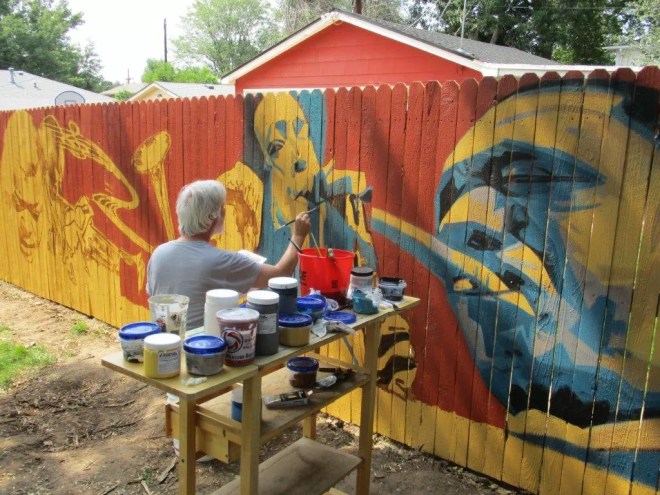 Chilean artist Adolfo Romero installs hopscotch art on Santa Fe Drive.
