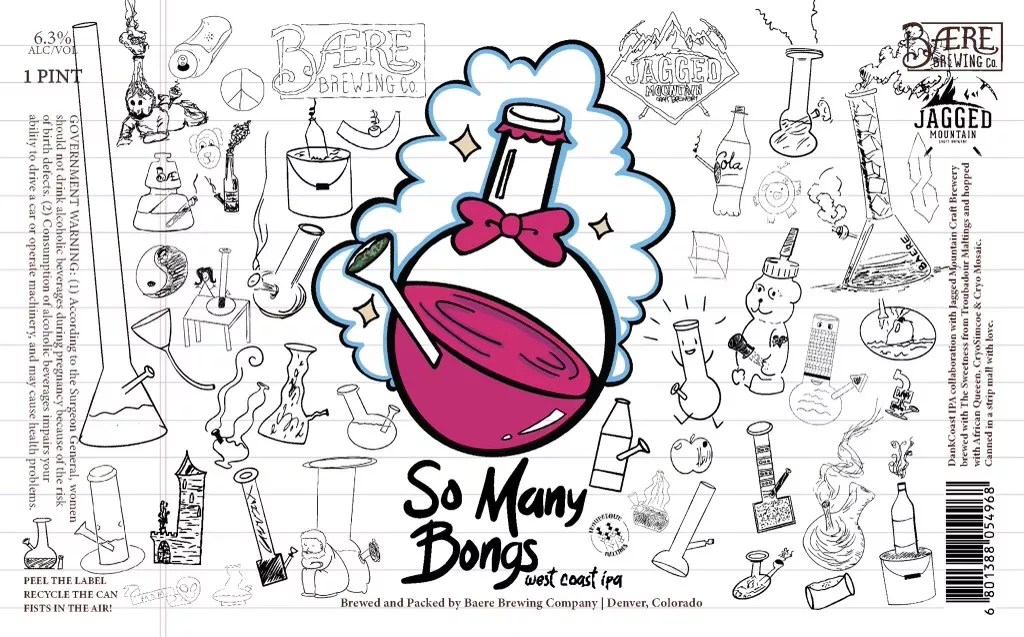 Jagged Mountain Craft Brewery and Baere are throwing caution to the smoke-filled winds with an unusual label for their new collaboration, So Many Bongs. This 6.6 percent ABV West Coast-style IPA was brewed at Baere with malt from Troubadour Maltings and hopped with African Queen, CryoSimcoe and CryoMosaic. The mesmerizing artwork was created “by digitizing doodles of bongs that customers at both Baere and Jagged Mountain drew over the course of a couple weeks,” the breweries say. It will be on draft and available in cans to go at both taprooms.