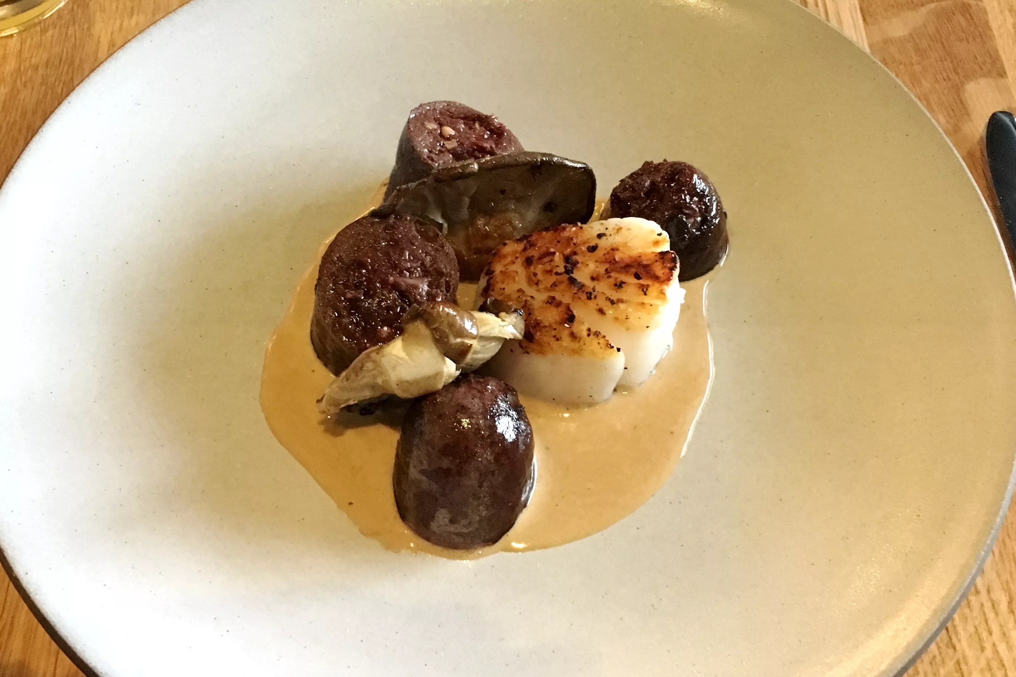 Blood sausage with scallops, oyster mushrooms and mushroom sauce.