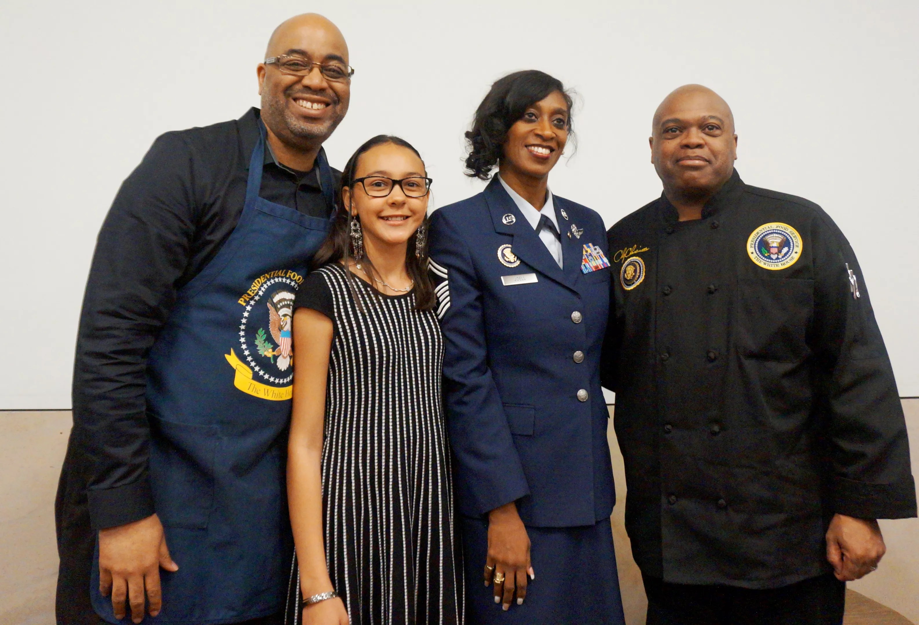 Adrian Miller (left) with guests Kiana Farkash, Senior Master Sergeant Wanda Joell and executive chef Charlie Redden.