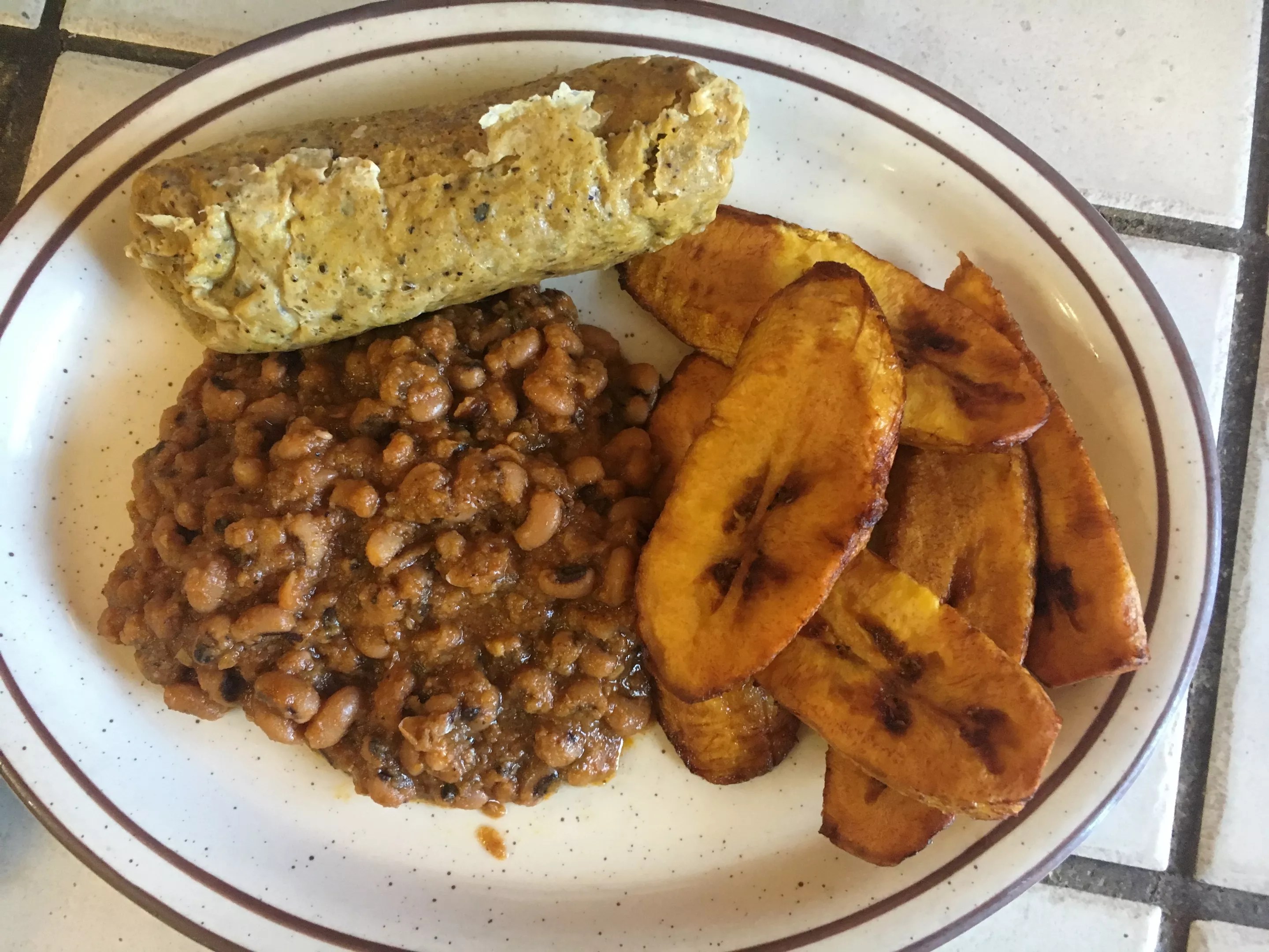 Red red is a Ghanaian dish of stewed black-eyed peas served with plantains. A steamed cake called moi moi adds even more black-eyed peas to the plate.