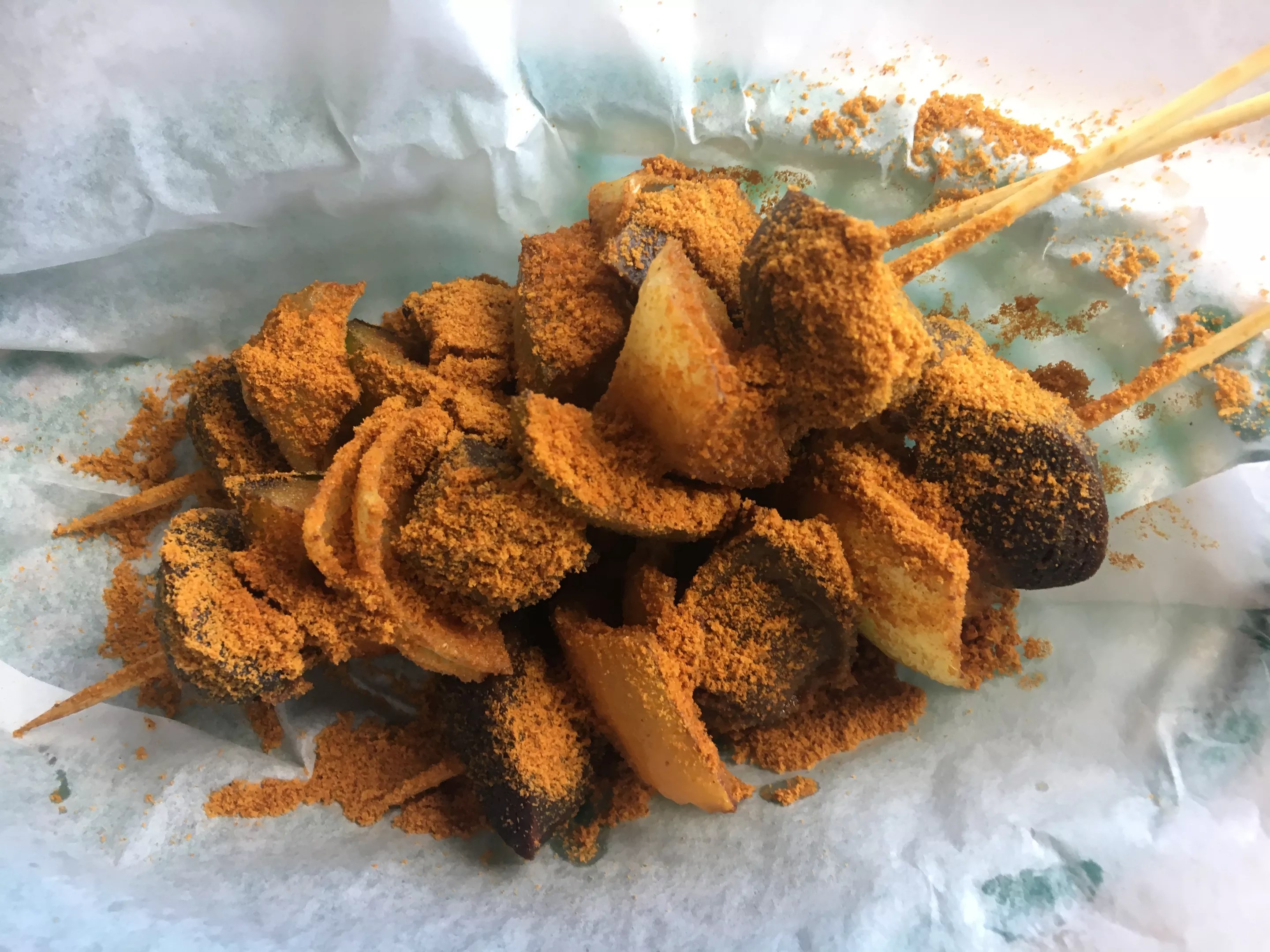Turkey gizzard skewers are dusted in a mild spice blend that includes ground peanuts.