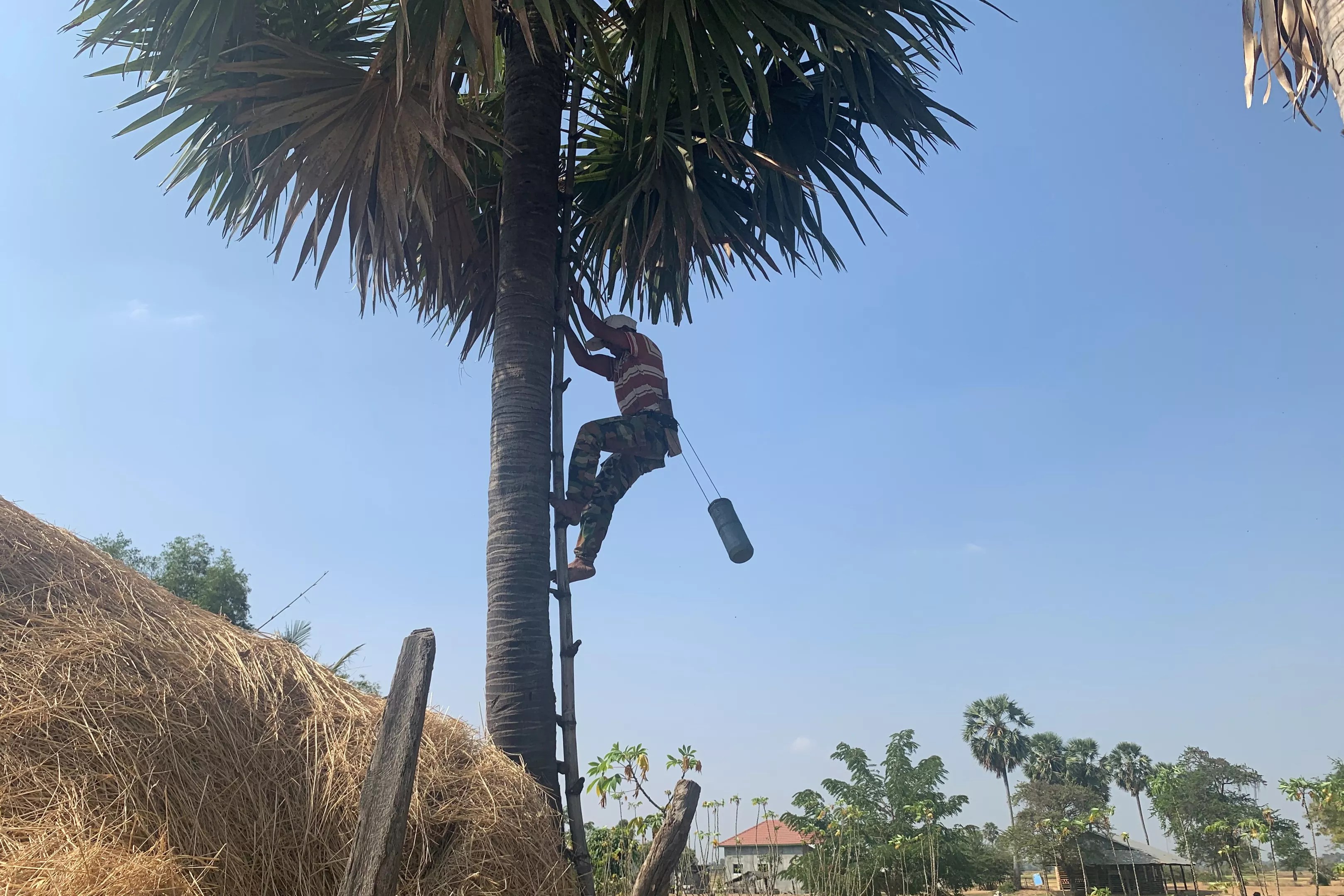 A farmer in Cambodia climbs a palm tree to collect sap.