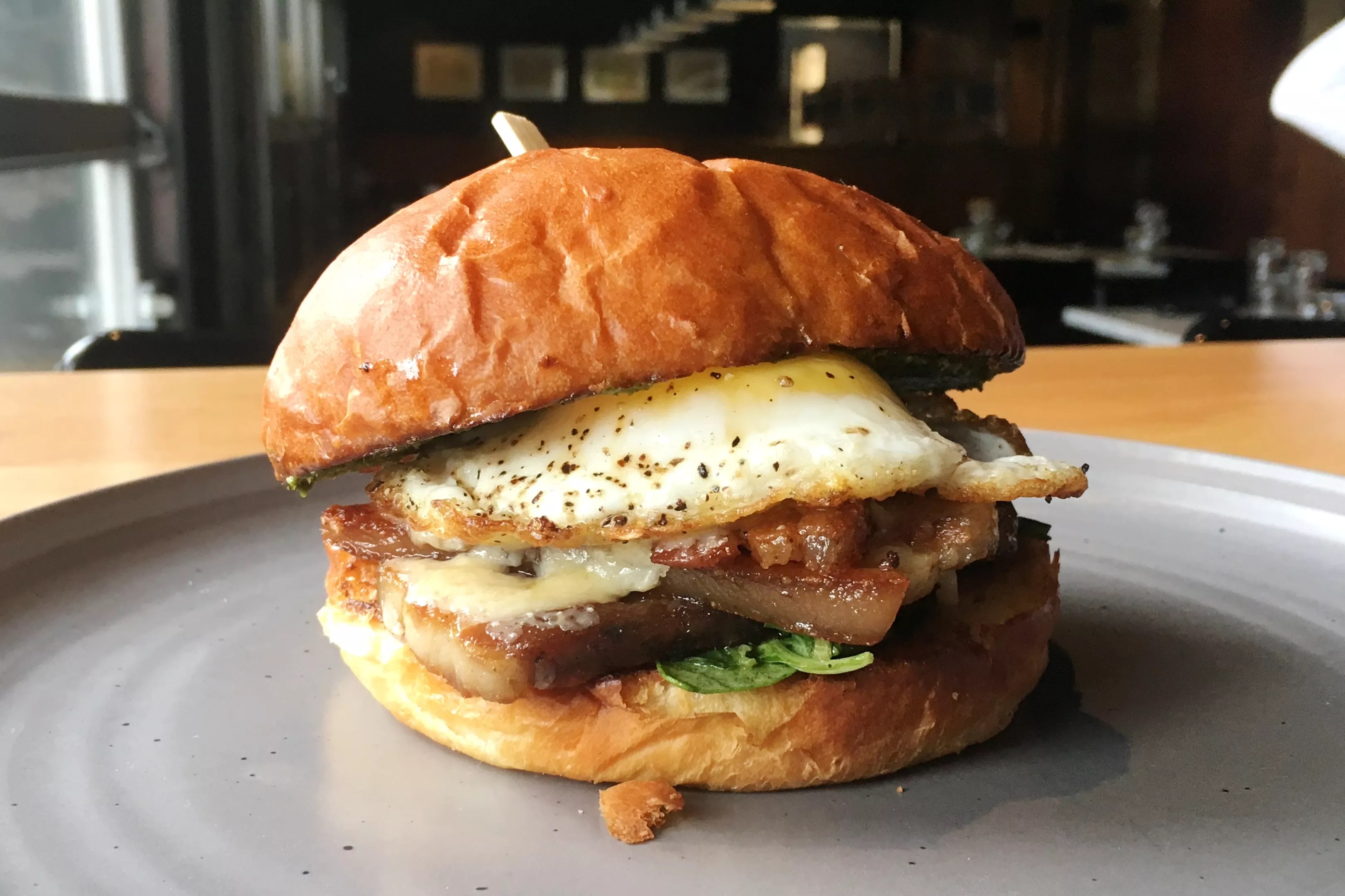 Of course, there are simpler preparations too, including a basic breakfast (two eggs, smashed tots in place of hash browns and a choice of meat), banana pancakes with candied pecans, and French toast, though even this most over-utilized brunch dish gets upgraded here with a filling of strawberry mascarpone. On the handheld side, a satisfying breakfast sandwich of braised pork belly, white American cheese, salsa verde, more smashed tots and a fried egg comes on a Grateful Bread brioche bun.
