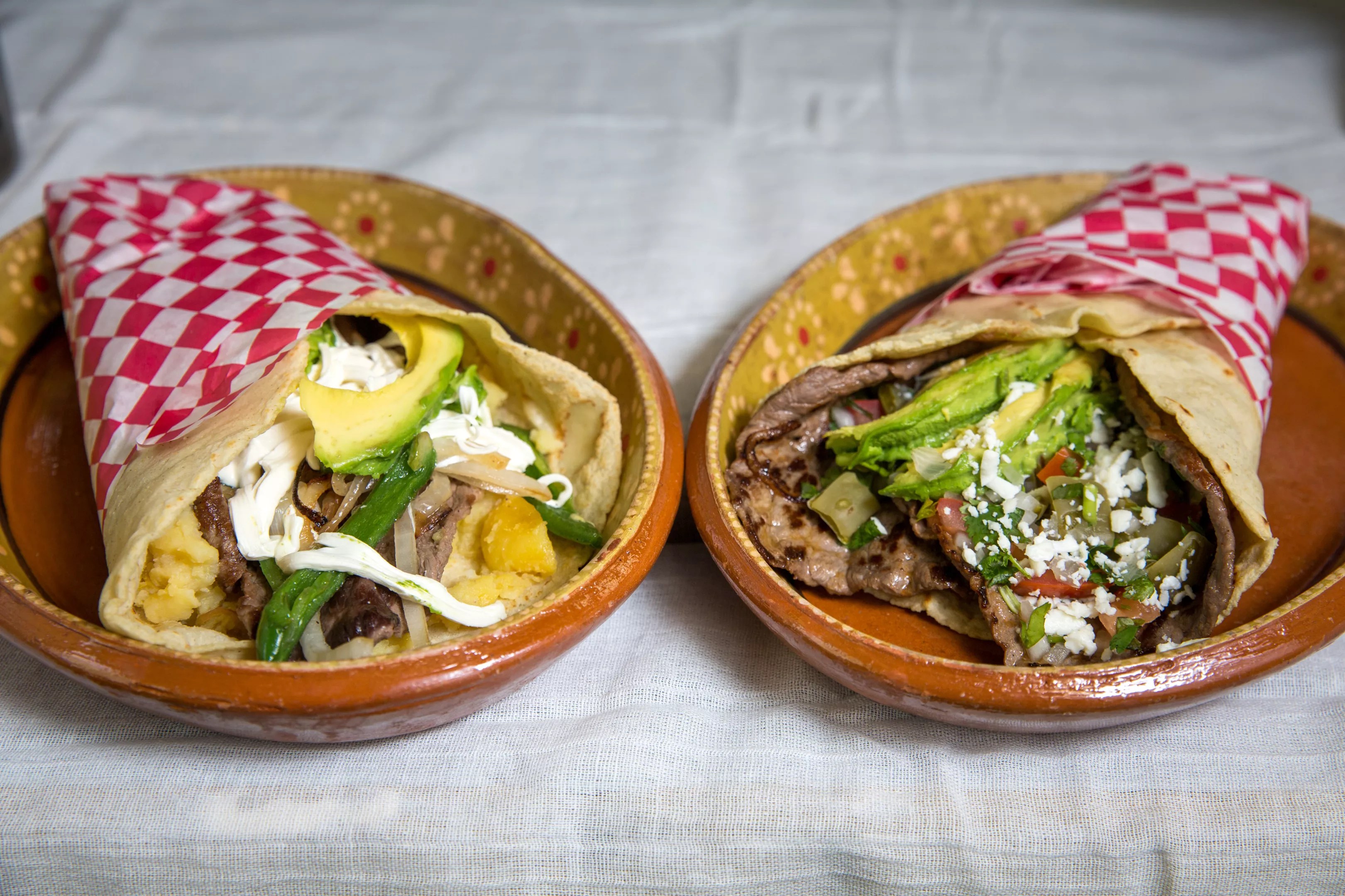 But it’s clearly a taco, not a burrito. The expansive tortilla constraining a heap of pinto beans, cecina (semi-dried slices of beef), nopales, avocado and crumbled queso fresco is made from corn masa, not wheat flour, and it’s served folded, not rolled. The thing is so unwieldy it requires a foil wrap on one end – the way Greek gyros are often presented – and two hands to ferry it to your face.