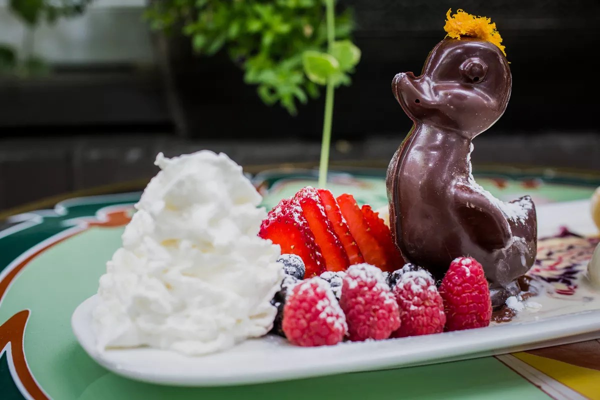 The tables around us did laugh, however, when we got to dessert, which is one place where Cerny freely unleashes his originality. Not on the burnt-cream Angelina, a thin variation of crème brûlée, but on the most expensive dessert you’ve likely ever ordered. For $25, you get two ducks, cast in chocolate and filled with lemon curd, marching on a plate like Easter bunnies escaping from children’s baskets. Some guests might want to simply relish the treat (and the fact that a restaurant has served something other than ice cream and bread pudding), spooning it up with orange-zested ice cream, meticulously sliced fresh fruit, crème anglaise and Chantilly. But others might find catharsis in smacking the ducks with a meat tenderizer, releasing lemon curd, shards of chocolate and some political steam. After all, consider the dish’s menu description: “What an election! Donald ducks marching to Washington.”