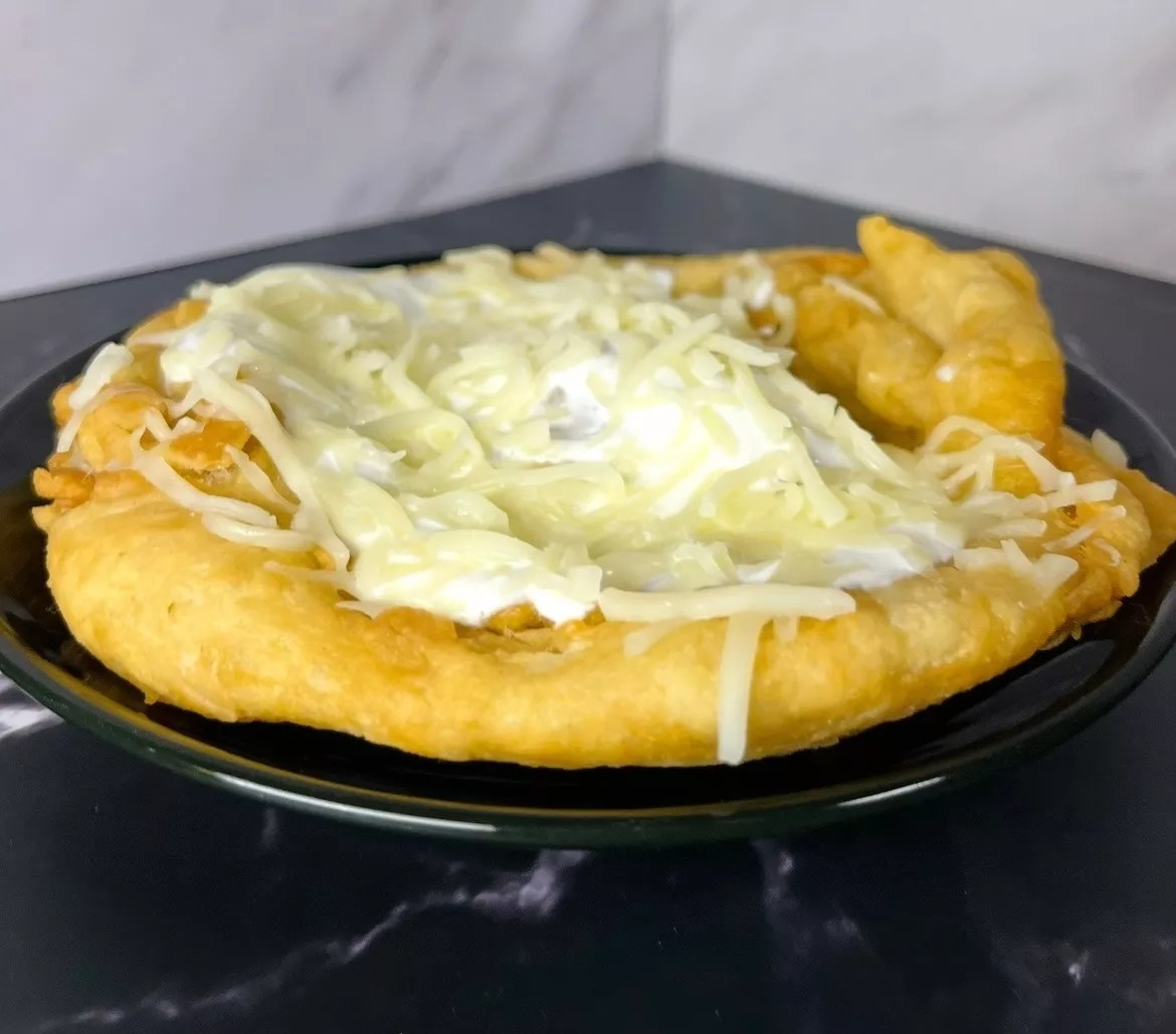 Langos is a fried flatbread that is crispy on the outside and fluffy on the inside; the Traditional is topped with garlic oil, sour cream and cheese.