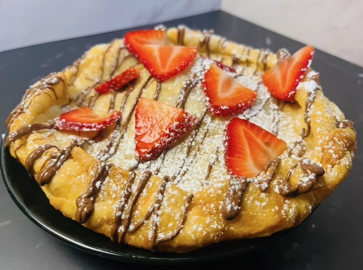 A sweet langos with Nutella spread, sliced strawberries and a dusting of powdered sugar.