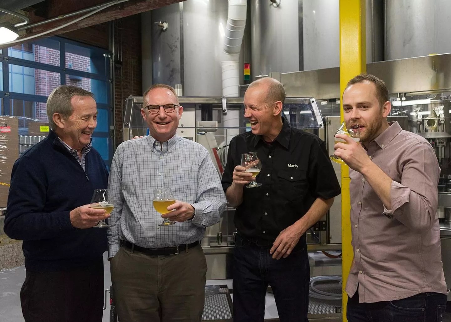 Peter Love (far left) and Russell Love (far right) at Tivoli Brewing in Denver.