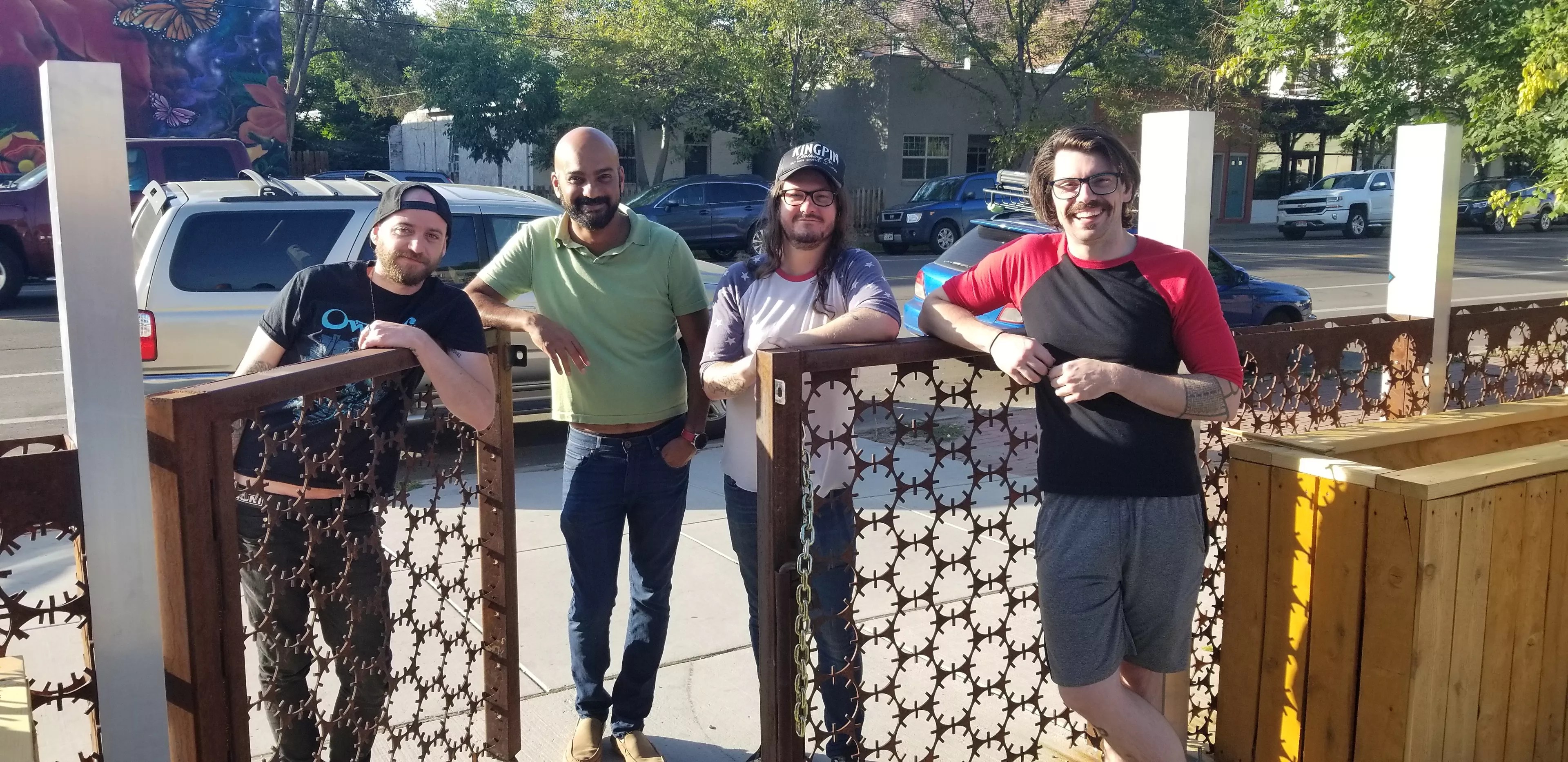 From left: Owners Michael Reilly, Sudhir Kudva, Colin Hankins and Corey Costello outside the future site of their magical bee-habitat patio.