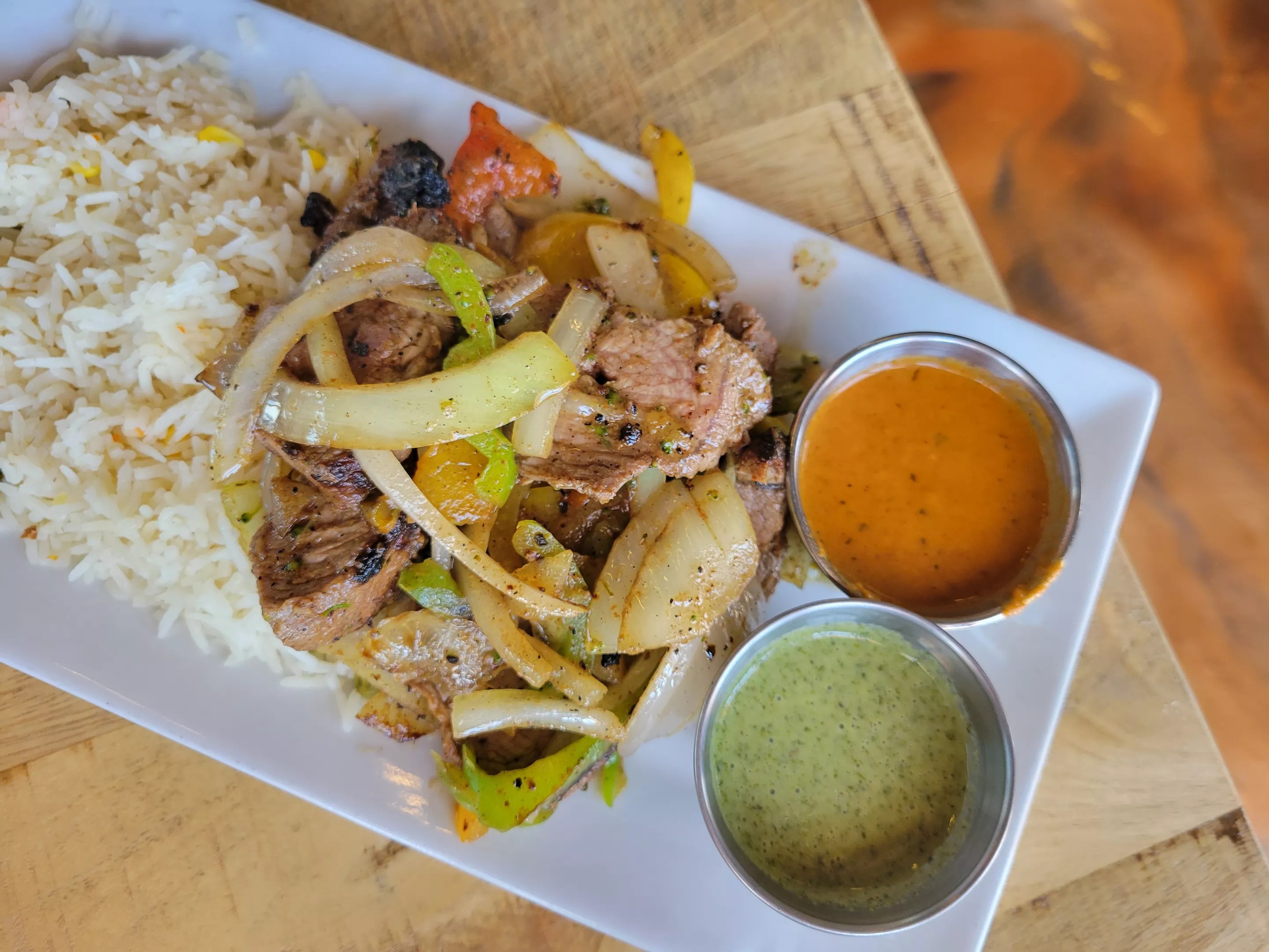 The wings, too, can lean toward either standard American or Indian flavors. A plate of six, ten or twenty can be tossed with a classic barbecue rub or lemon pepper. For an Indian kick, opt for the rich vindaloo sauce or the sweet-and-spicy mango chutney. We also tried the lamb kabob, a succulent piece of meat with spiced peppers that’s served over rice with Indian dipping sauces. Pro tip: Ask for a side of cooling, yogurt-based raita and mango chutney, too.