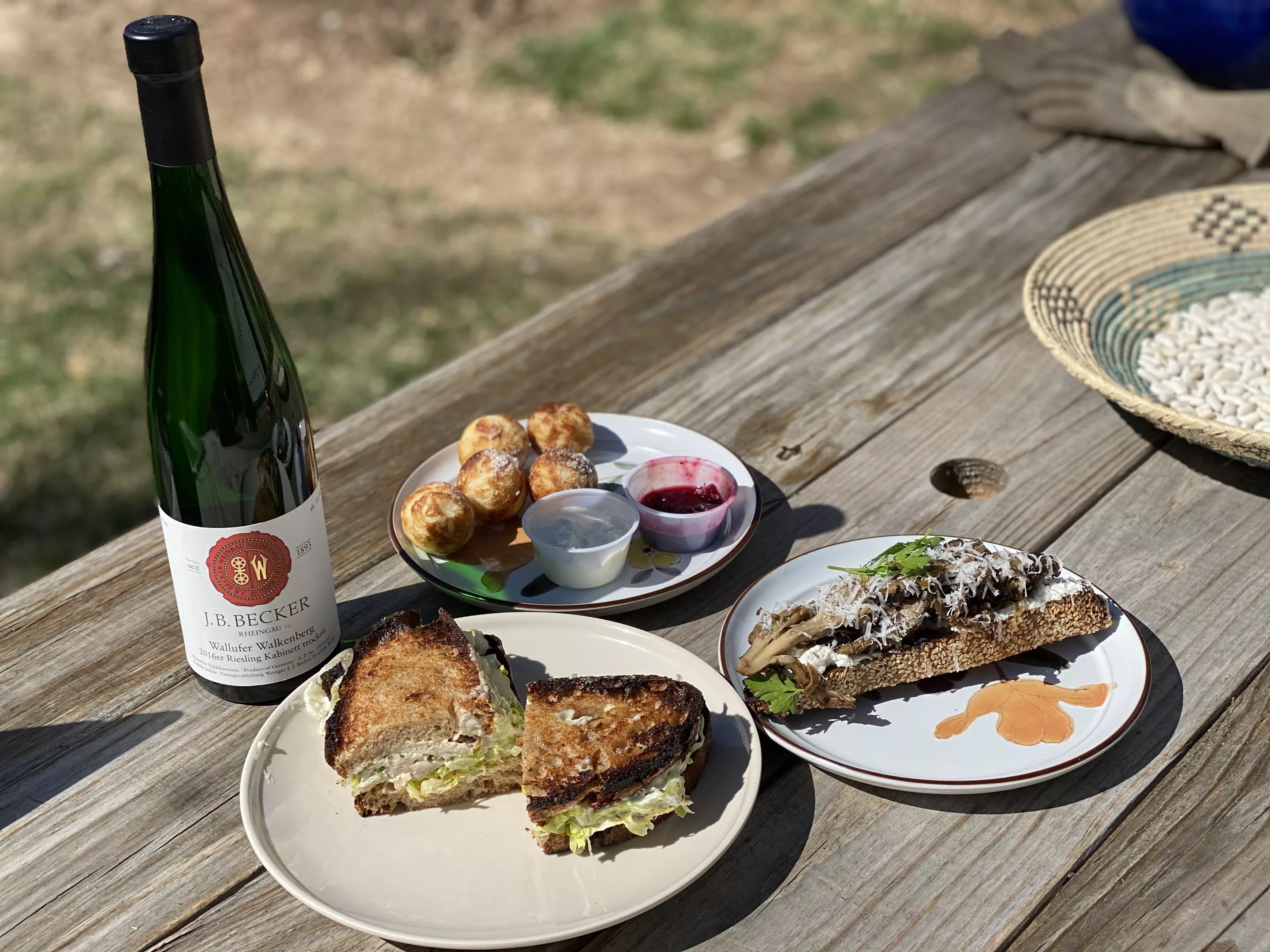 I opted for Chef Duncan’s World Famous Chicken Salad Sandwich, the Smoked Mushroom Tartine, and, while I would have loved to mow down a Pork + Fried Egg Sandwich (which I already knew was one of the best sandwiched pork products in Denver), I decided I should expand my horizons with the Danish aebleskiver. And, lest I forget, I went with Call’s $30 white-wine option, which turned out to be a light German riesling (a 2016 Weingut J.B. Becker Wallufer Walkenberg riesling kabinett trocken), something that would under normal circumstances have made an appearance at one of Beckon’s multi-course tasting dinners – turned into a cherry-picked deal special to these times.