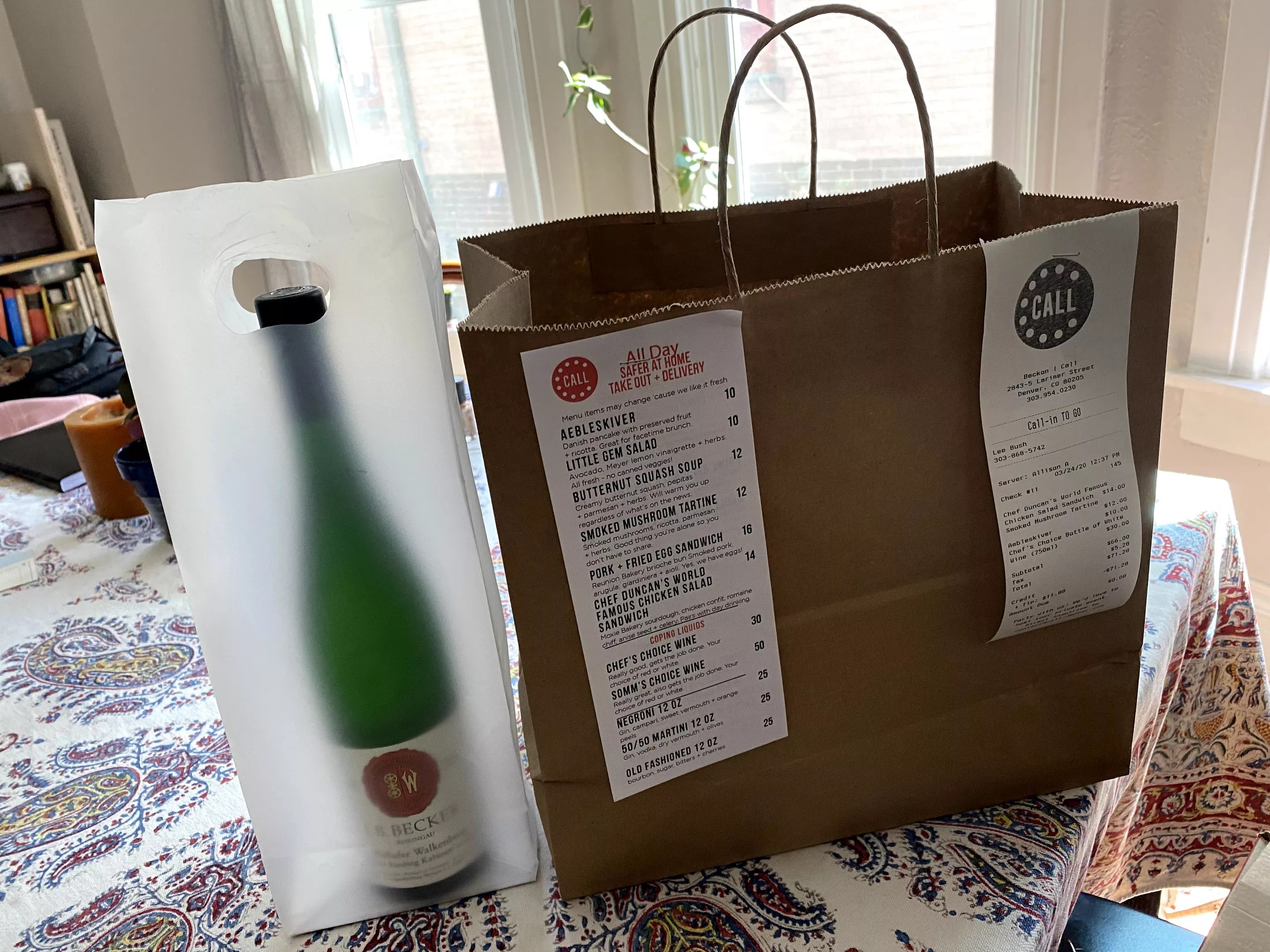 As so many of our favorite restaurants have been forced to close to diners during the coronavirus pandemic, one space that had been closed for a remodel before the mandated shutdown has been able to reopen its service, at least partially, to the public. Call, Beckon’s more casual sibling, has popped up during its still-in-progress remodel (which began last fall) to offer its delights to takeout and delivery customers. Given how sad I was to have to give up my regular RiNo stops at Call in 2019 because of the remodel, I was thrilled to make it my first carryout happy hour.