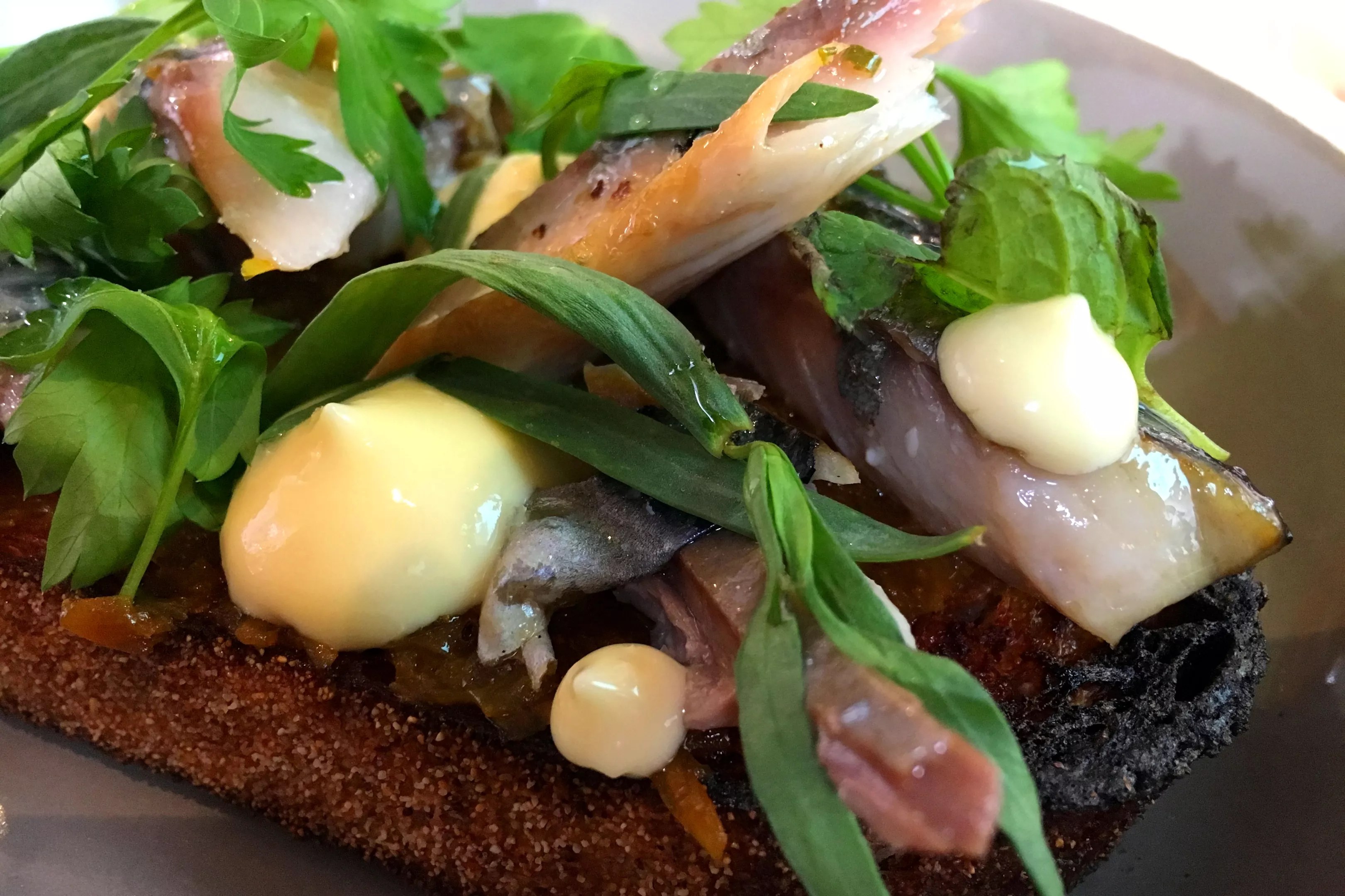 Lunchtime calls for heartier fare, so Call has constructed something the Danes would surely love. Fresh mackerel are brought in and broken down, becoming glistening wedges that decorate toasted rustic bread, along with generous dollops of roasted-garlic aioli, a smear of curried and caramelized onions and a shower of fresh herbs. The mackerel gets its silky texture from bathing in seasoned olive oil (almost like a confit) after its skin is charred under the broiler.